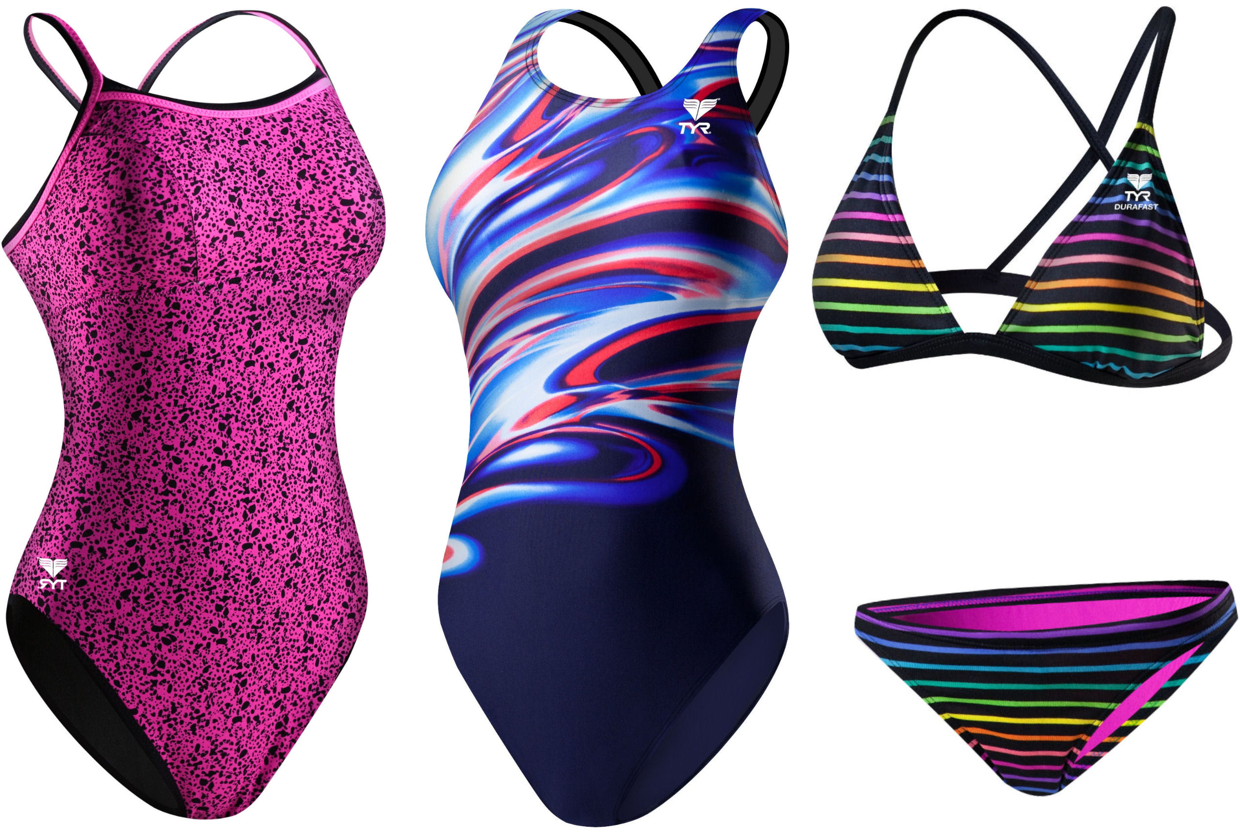 I am not a Triathlete or an Iron Woman, and my paltry gym workouts would make these fully fit athletic machines laugh, so hearing that TYR uses new, state-of-the-art technology that helps you glide through water or keeps you dry when you’re running a race doesn’t do me a whole lot of good. But then, I saw them. The diamond or ring-back, one-piece swimsuits may be technologically perfect for a swimmer, but the designs, with names like “Shockwave”, “Aries” and “Sunset Beach” are beautiful and stylish. The Thin-X Back designs, like “Rockstar”, “Graffiti Floral” and “Groovy” are colorful and cute, and even come in bikini styles. There’s also a series of reversible models, plain and utilitarian on one side, cute and rockin’ when they’re inside out.