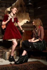 The setting was a series of tableaux, designed to take you inside rustic cabins in the prairie with a décor straight out of a 1920’s penthouse (there was even a kind of a creepy uncle among the young models in their girlie dresses and Danni Jo jewels), matching the inspiration for the line. The sisters, once named to Inc. Magazine’s list of “America’s Coolest Entrepreneurs”, create their rings, necklaces and bracelets out of a variety of metals, oxidized silver, gold and gunmetal, adorned with elements like quartz, crystals, aqua aura and pearls. This time, they added Swarovski Crystals for a little extra shine.