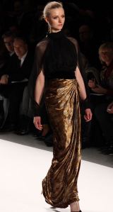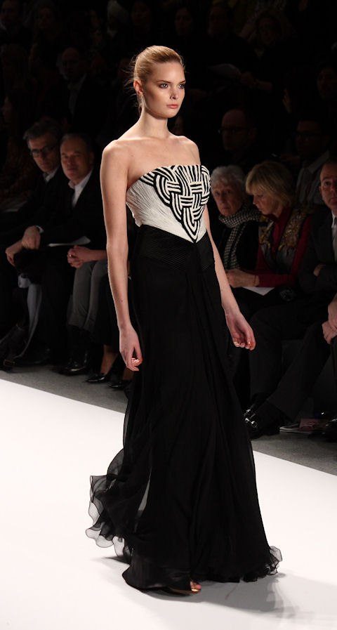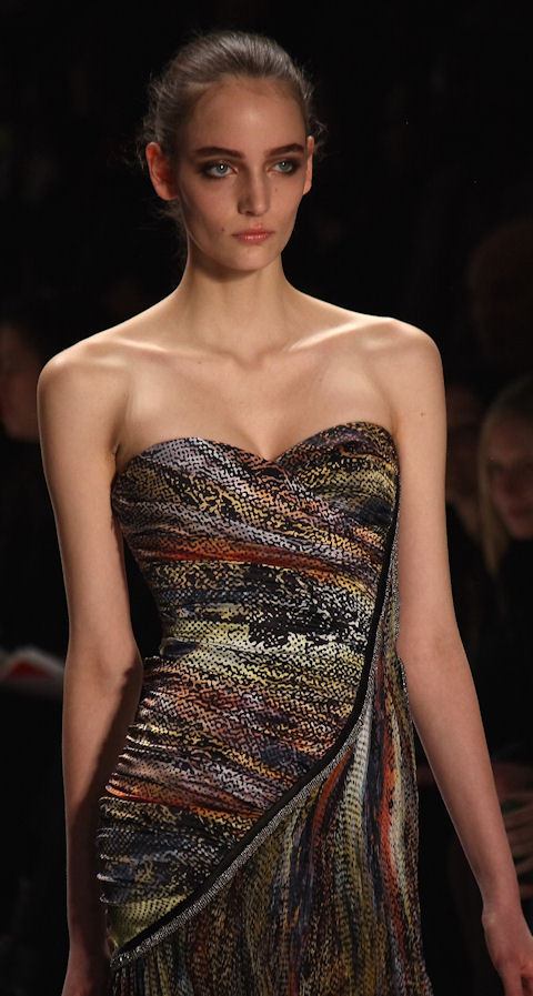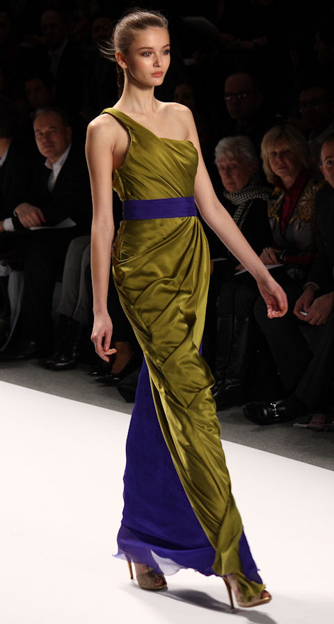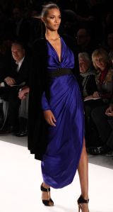 Evening wear just belongs to Carlos Miele. A black velvet gown with braided embellishments was sophisticated and beautiful. Another gown popped in royal blue. Even the more muted colors like khaki greens were treated to bright bursts of color.