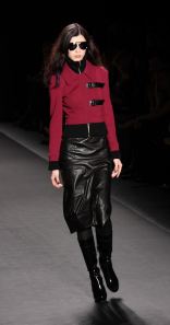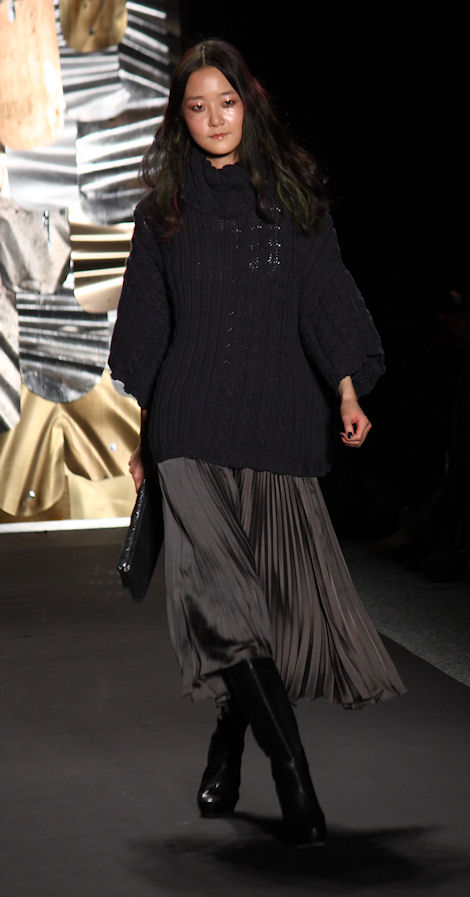 Disappointing fur aside, her designs are never less than enchanting. For Fall, she’s showing some grays and blacks, of course, but the richness of her colors truly stand out. A deep gunmetal, accordion-pleated skirt was paired with a chunky sweater, a mix of textures that would appear again and again, as in a pale pink accordion-pleated skirt matched with a sleek jacket and a sparkly, sequined top paired with a buttery bronze leather skirt. There were beautifully cut pants, tight to the knee, then opening into the subtlest flair.