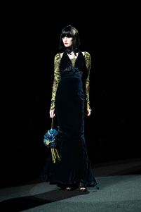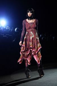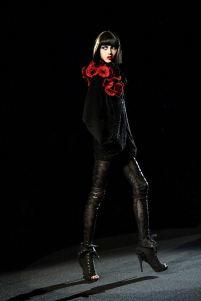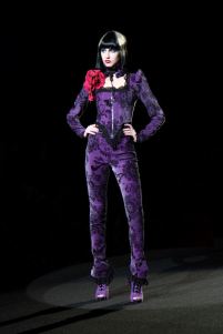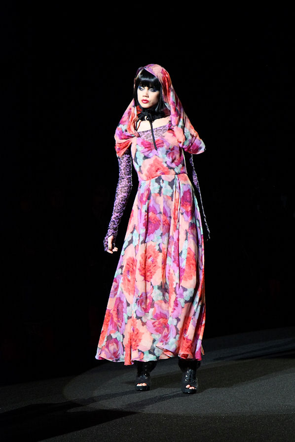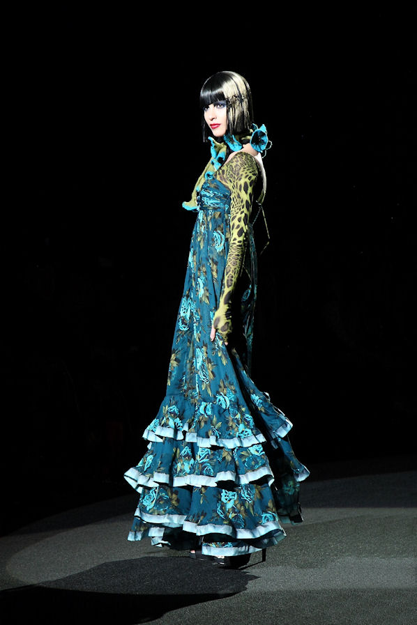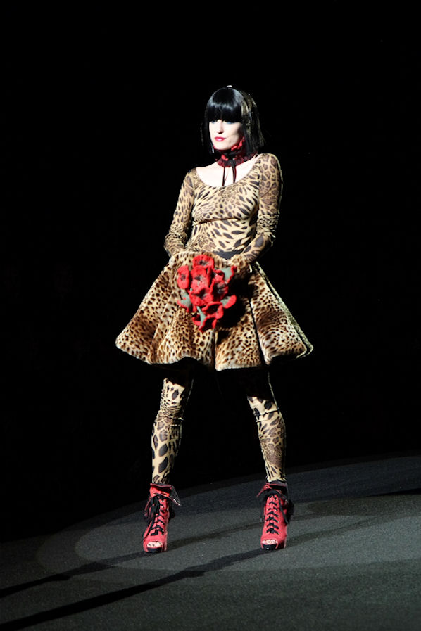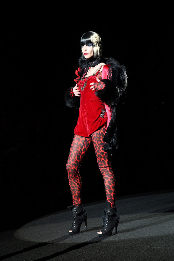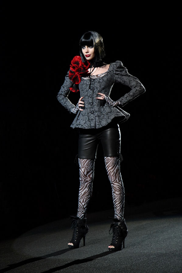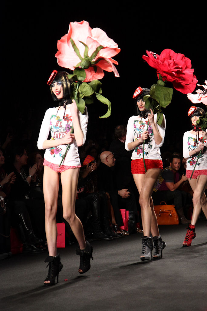 For Fall 2011, the theme was “He Loves Me, He Loves Me Not.” It was Valentine’s Day, after all. The first half of the show featured models romping down the runway in black wigs, animal prints and plaids, along with the requisite flowers on the clothes and around their necks. All of the designs were from Betsey’s “Black Label” line. This was her version of “He Loves Me Not”.