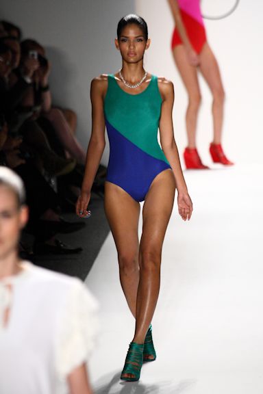 The concept worked in fitted jackets and slender, shining dresses. It worked best in Ruffian’s brand new addition to the line: swimwear, in bright, diagonally-matched colors, blue and green, red and pink.