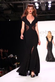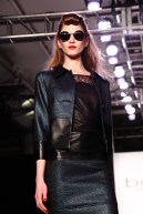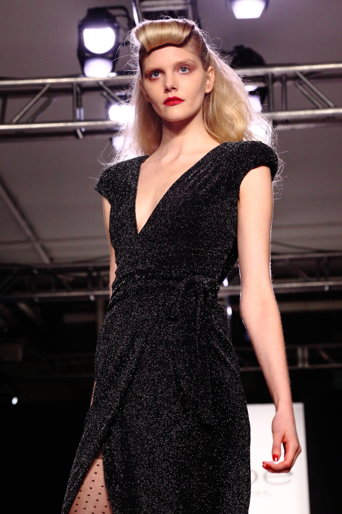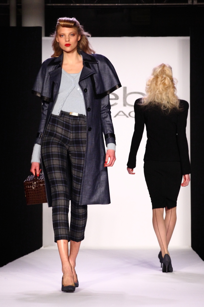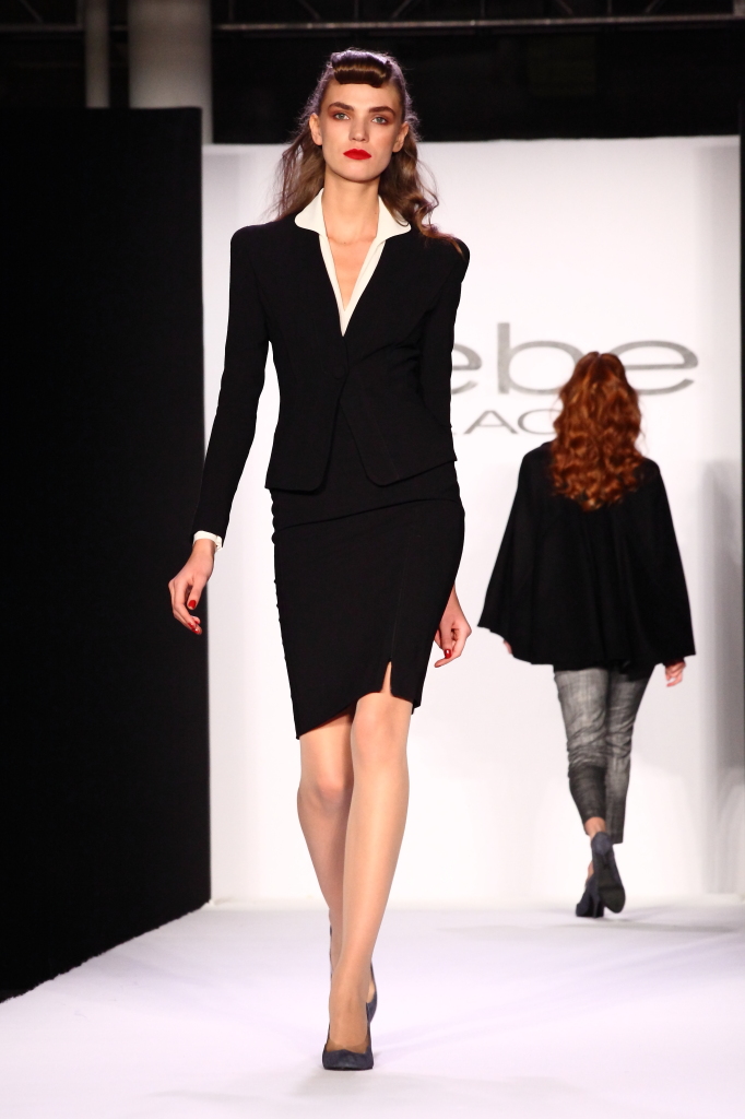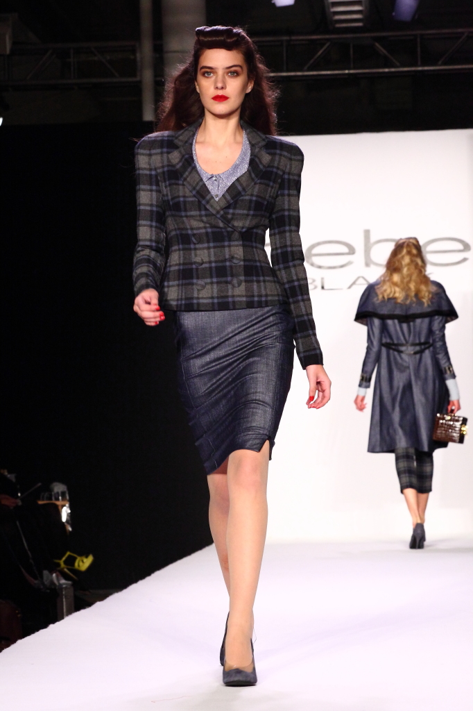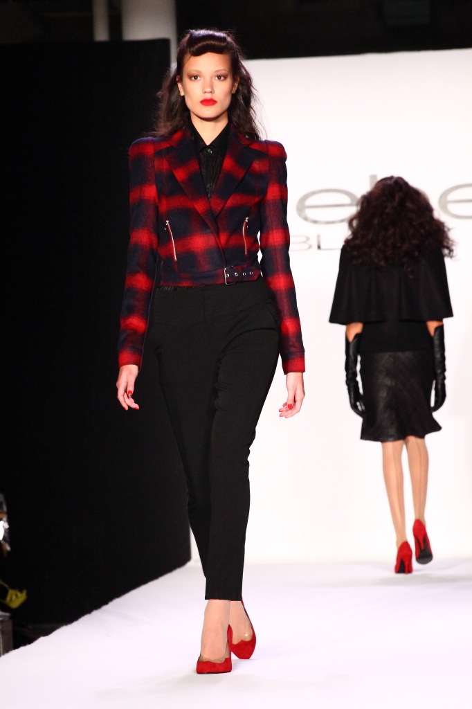 For Fall/Winter 2012, Bebe Black showed lots of black, of course, but also vibrant pops of color in the form of tartan and lumberjack plaids. The 40’s looking glamour began with bright red lipstick and pin-up curl bangs with long, cascading waves. The collection was inspired by film noir, tinged with a futuristic vibe.
