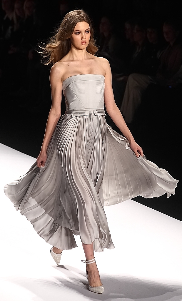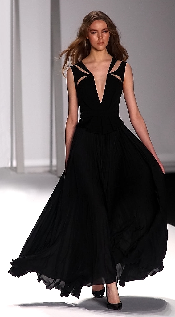 A dangerously low-cut aubergine gown made the same statement: that Mendel is reaching out to a new, younger audience. There were so many standouts, like the white gown with side cutouts, trimmed in gold, another black with a cut-out peplum top and accordion-pleated skirt, and a strapless, ethereal silver-gray that looked lighter-than air.