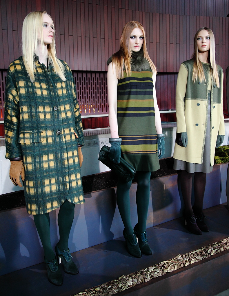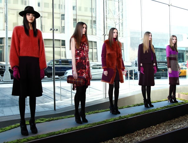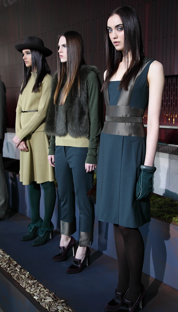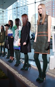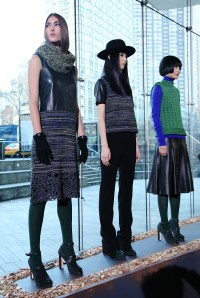 Roy showed in a presentation at Lincoln Center’s Alice Tully Hall, a great venue where the press and invited guests got to mingle with the designer and view her collection. There were a lot of standouts here: slacks, skirts and dresses inspired by the great outdoors. The mix of patterns and textures is what made it most interesting. A leather skirt was paired with a chunky sweater, designed to look like a turtle-neck covered with a vest. The prints in sweaters and dresses were earthy, the colors, mostly muted.