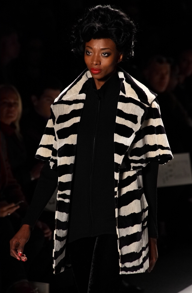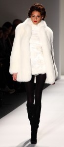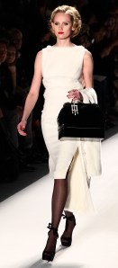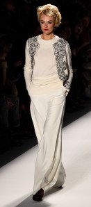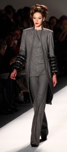For Fall 2012, he pulled out all the stops, and wrapped it around a glamorous ‘60s vibe, an ode to a look from the ‘60s not often mentioned.  Bright white dresses, suits and skirts were opulently embellished in silver and stones, blacks and greys were overlaid with white lace.  Work suits were buttonless, with long jackets and long lines that made each model look 10 feet tall.  The looks were sleek, strong and, as always in a Zang Toi collection, elegant.