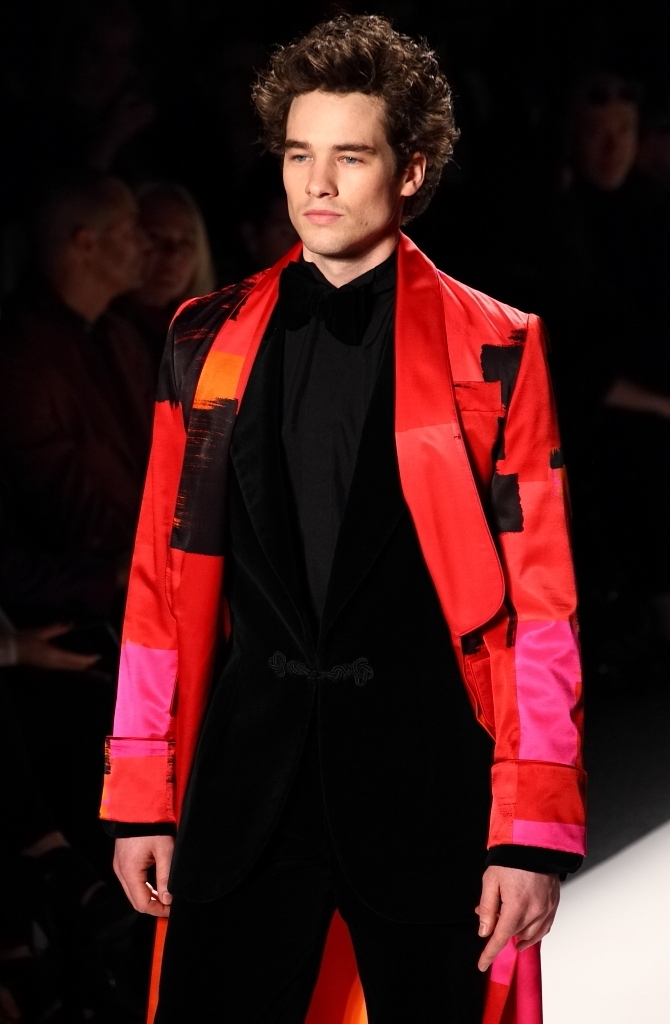 Red seemed to be a favorite color here, with several slim, beautiful red gowns walking the catwalk. There was even a red-based print that showed up in women’s evening wear, and one men’s long evening coat.