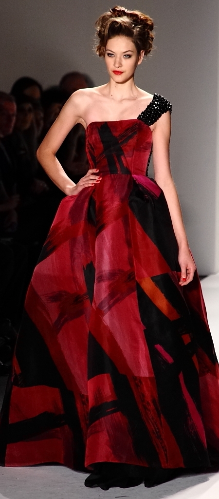 The show stopper was a wide gown in a more muted version of the red print, with one strap made from what looked like jet baubles.