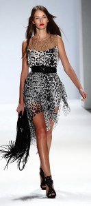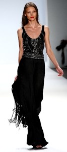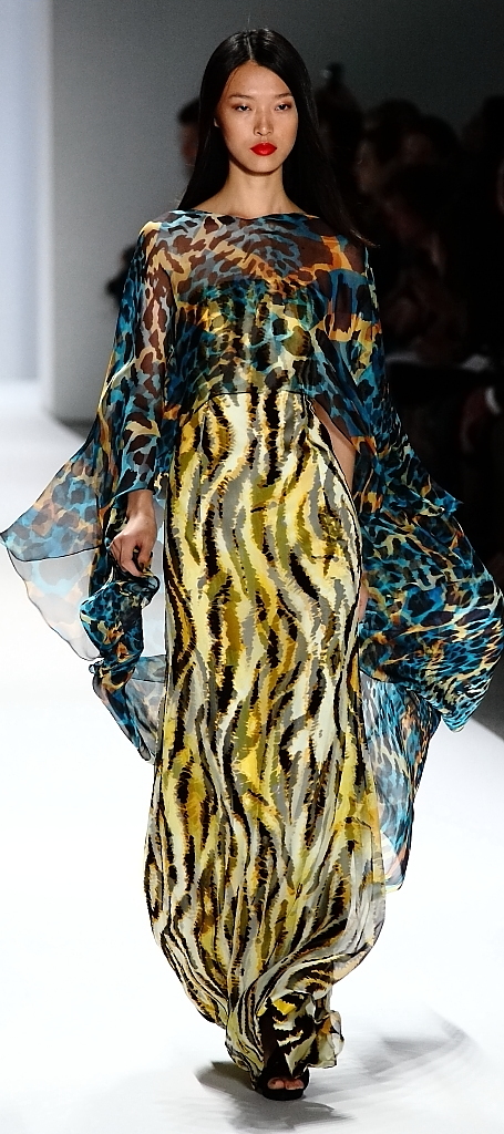 In Carlos’s jungle, giraffes come in blue, and mix easily with bright golden yellow tigers. And that was just the first look down the runway. Following was a short, black dress with lots of shine and fringe, perhaps a brief throwback to the Gauchas.