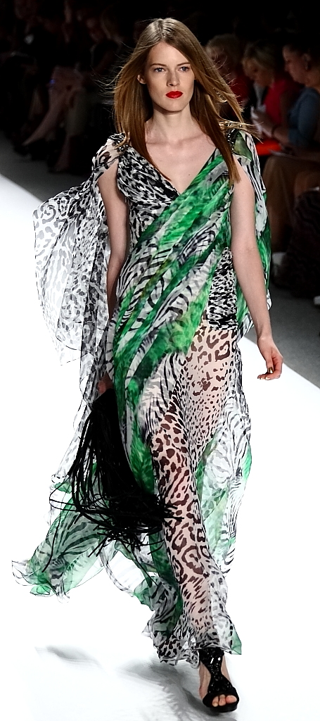 And it wasn’t only animal prints. Satins and chiffon mixed beautifully in soft, light pastel blues, beiges and bright greens, which seem to be appearing often this season. Fringe dots so many of the looks, long, crazy and yet never out there.
