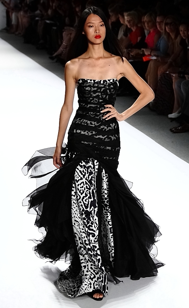 The blue giraffe and golden tigers emerged in a flowing cover-up and sexy strapless gown. Fabrics and textures mixed effortlessly: satin and silk, chiffon and leather. Ruffles were regular features, most exquisitely on a powder blue gown with big, big rows of ruffles at the bottom.