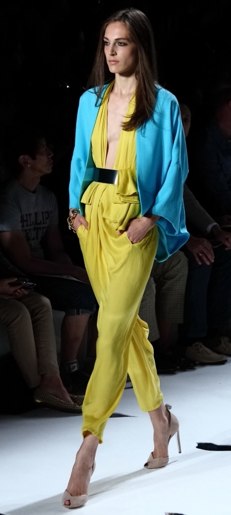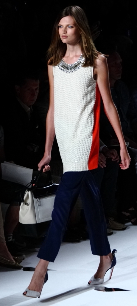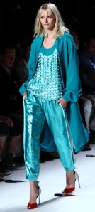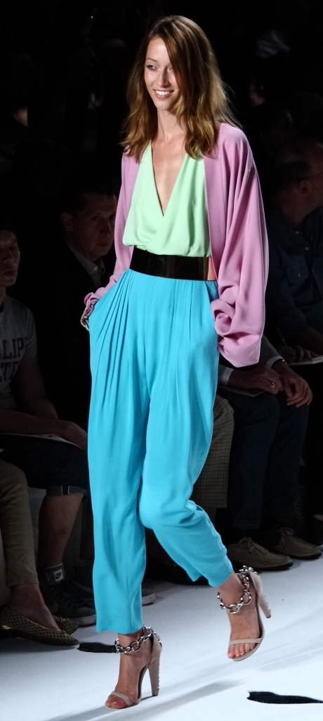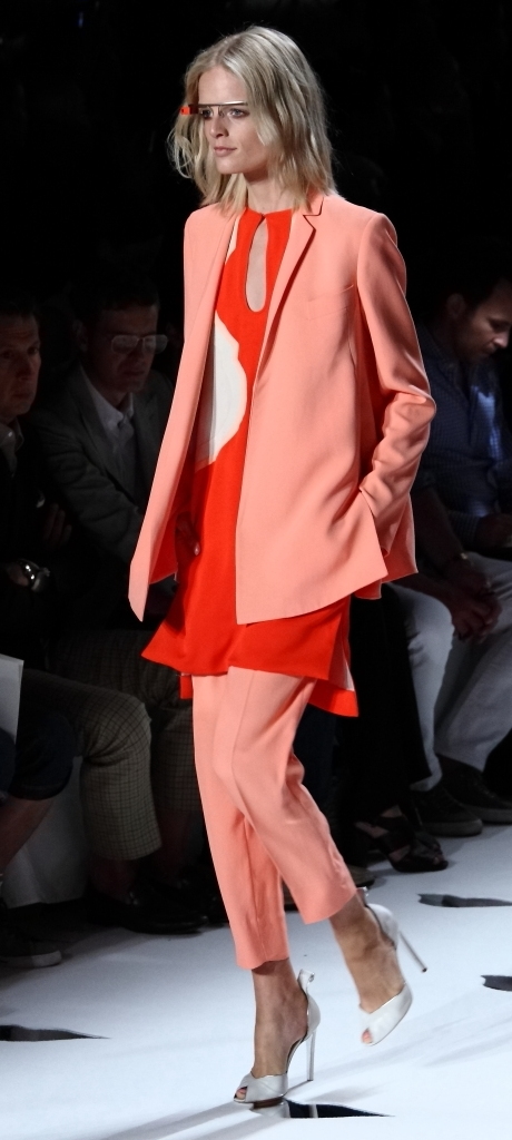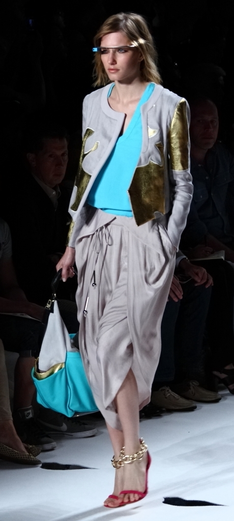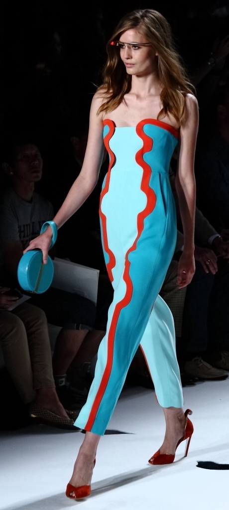 But she is a designer who doesn’t stand still, who always seems to look forward (note her collaboration with Google for this collection, and the fact that many of her models wore “Glass by Google” glasses on the runway. So her onesie in blue, turquoise and red really fit in. It couldn’t have been more modern, or more on-trend. But then, I suspect it is designers of her caliber who create the trends.