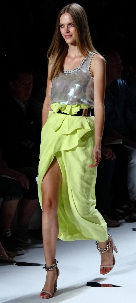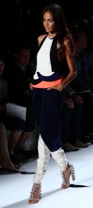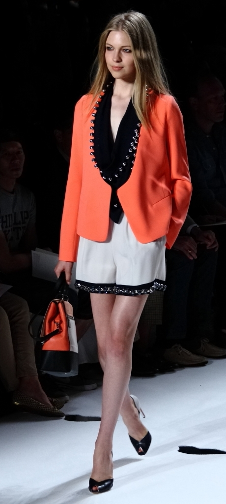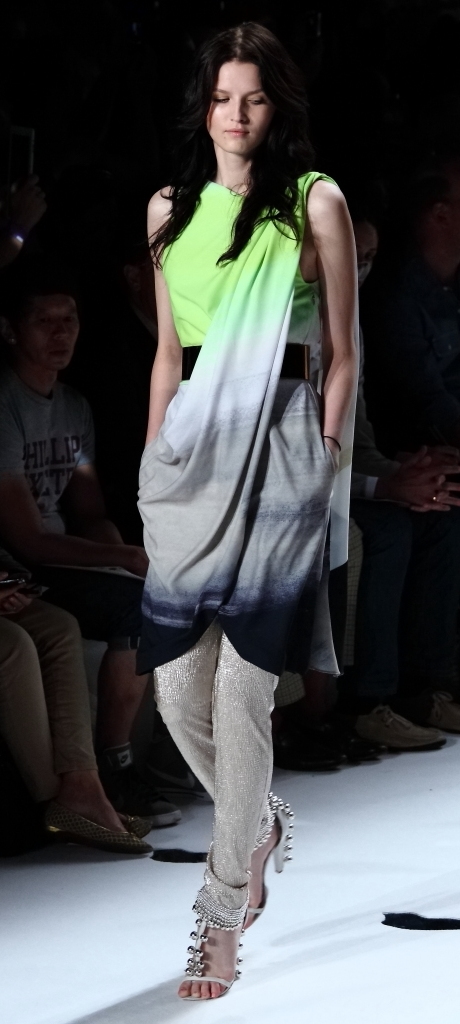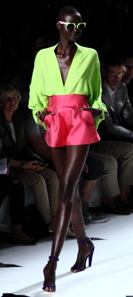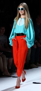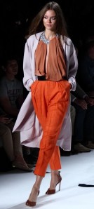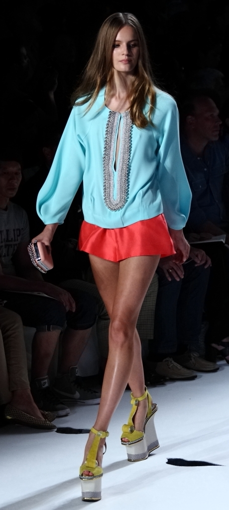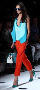 For Spring/Summer 2013, it’s all about the color: big, bold, fun and showy. It was mixed and matched in ways few of us could imagine, let alone pull off. And it worked. A bright, shiny turquoise was paired with orange and white. A soft teal top with over-sized sleeves went so well with red slacks. A grey jacket trimmed with gold leather was matched with a sea blue top.