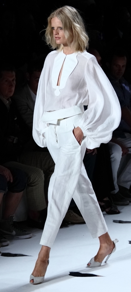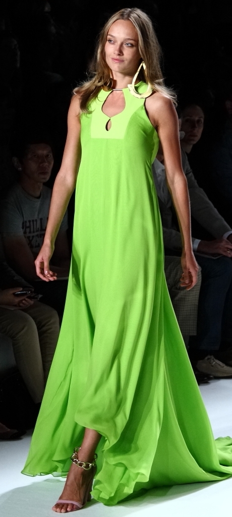 There was a decided Indian influence in the Sari-like tops with tight tapered pants in silk. Every color, the blues, the greens, the lavenders, the pinks and the corals were pastels with pop. Yes, sort of wearable pop-ice.