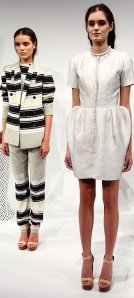 His collection is a study in simplicity.  The lines are straight, in skirts, dresses, pants, even tops.  The color palette is simple:  basic black, navy, crisp white and grey.  What interrupts the simplicity are the surprises. Little black dresses showed exaggerated shapes.  A simple white sleeveless dress hangs in an asymmetrical peplum.  A simple black top is totally backless.  So backless, you wonder for a moment how it’s kept on.
