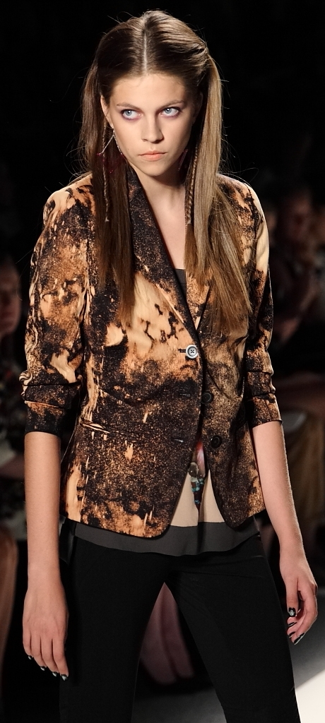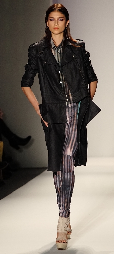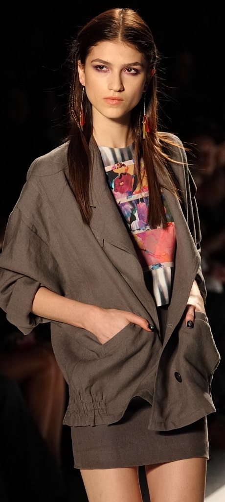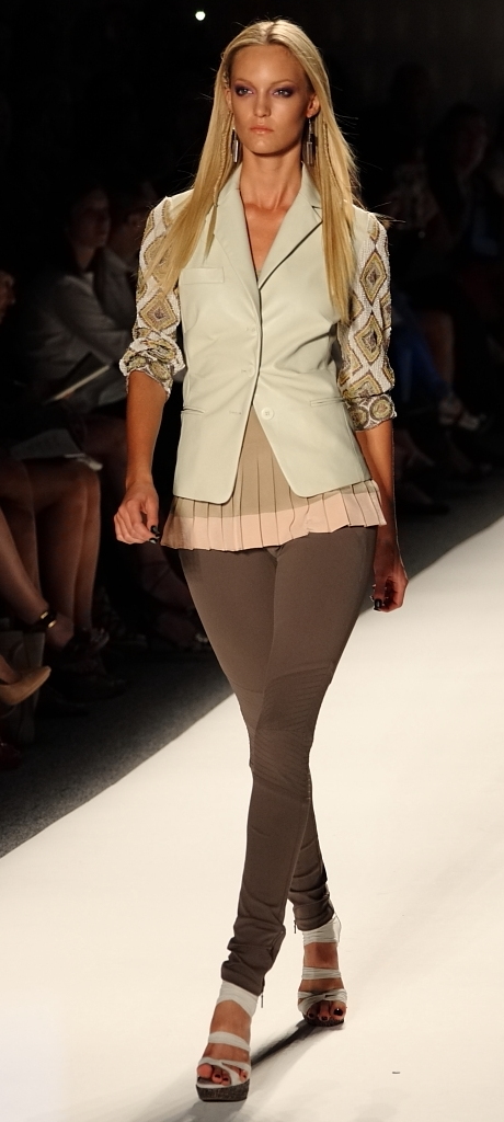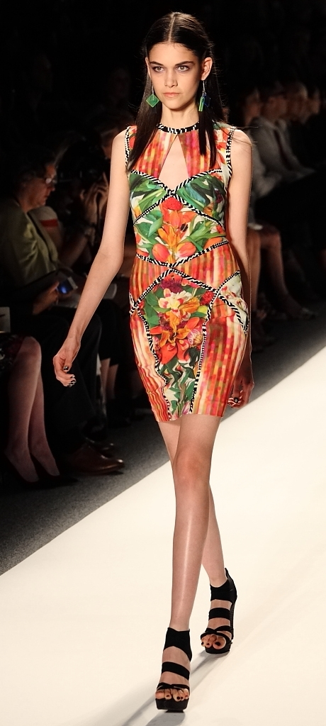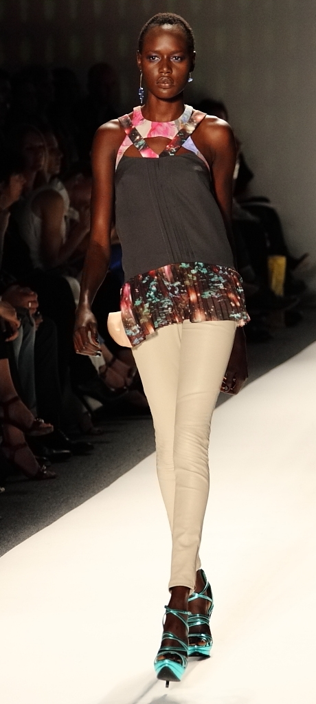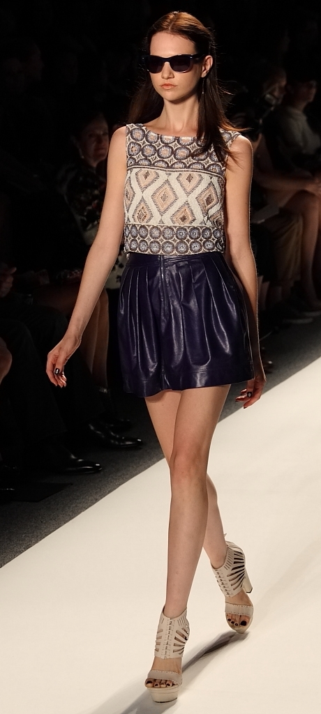 This season, Miller’s collection combined an explosion of color with a real street edge. Her statement started with the first look down the runway, a long leather coat over skin-tight leggings. That was followed by the same leggings with a black cut-out top with a real punk feel. Then came summer. A series of bright, tropical prints and blocks of bold color decorated strapless dresses, pants, skirts and tops. The looks were young, fresh and incredibly wearable.