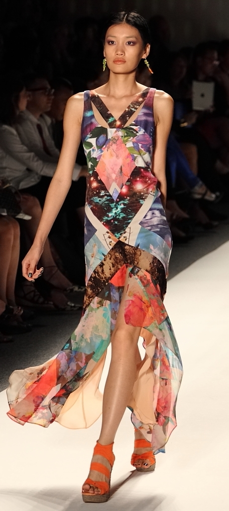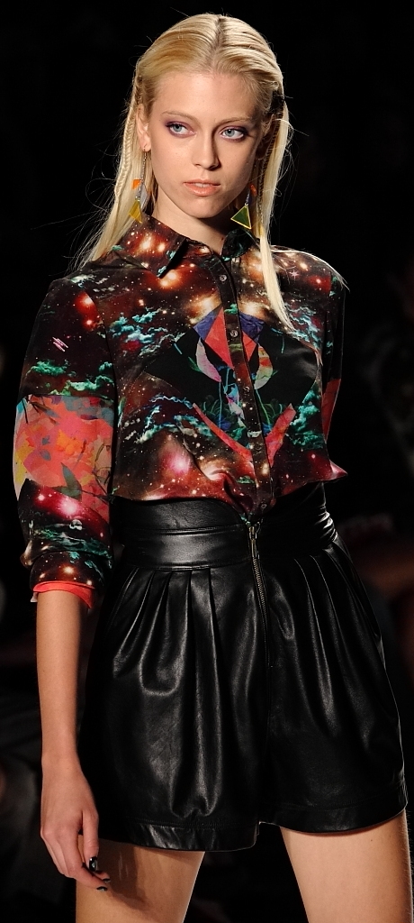 The edge returned when the bright prints turned from tropical to inter-galactic, the bright lights of the galaxies mixed with cool shorts, tight leggings and short, flirty skirts. And when the two prints combined in fitted summer dresses, the result seemed impossible on paper, but worked perfectly on the runway.