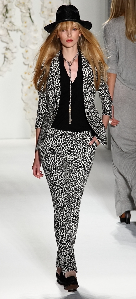 I don’t know if all stylists harbor dreams of designing their own lines, but Zoe made it a reality by creating styles that everyone can wear. They are ageless, timeless, original even when they’re retro. A white pants outfit with a bold black stripe reminded me of the Avengers’ Emma Peel, but with a very modern edge.