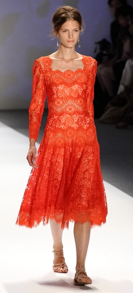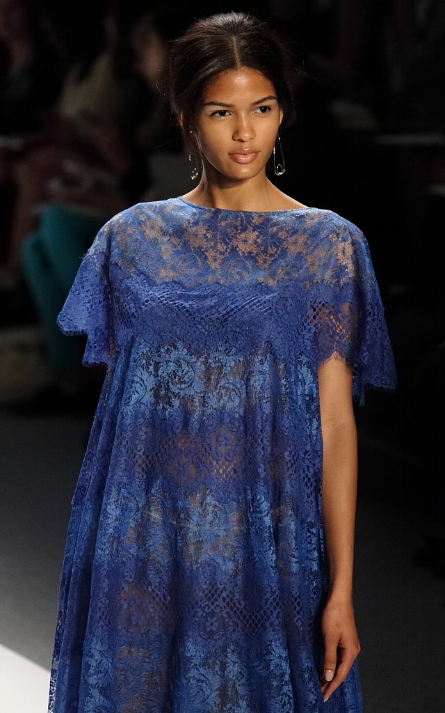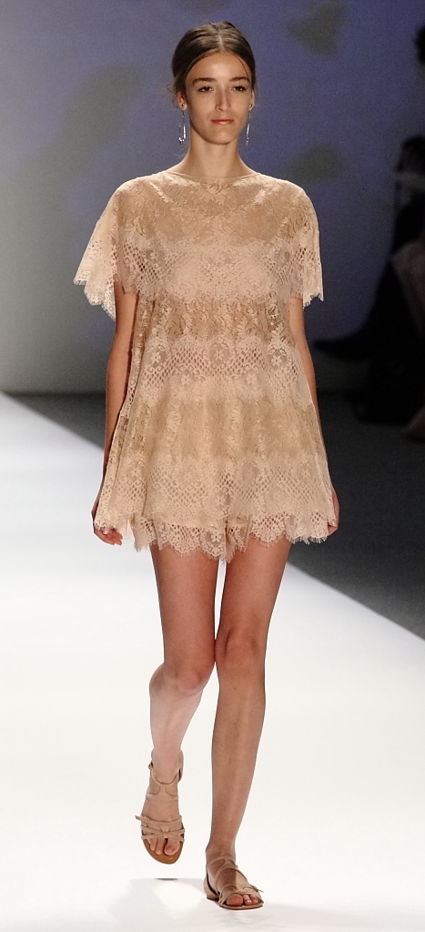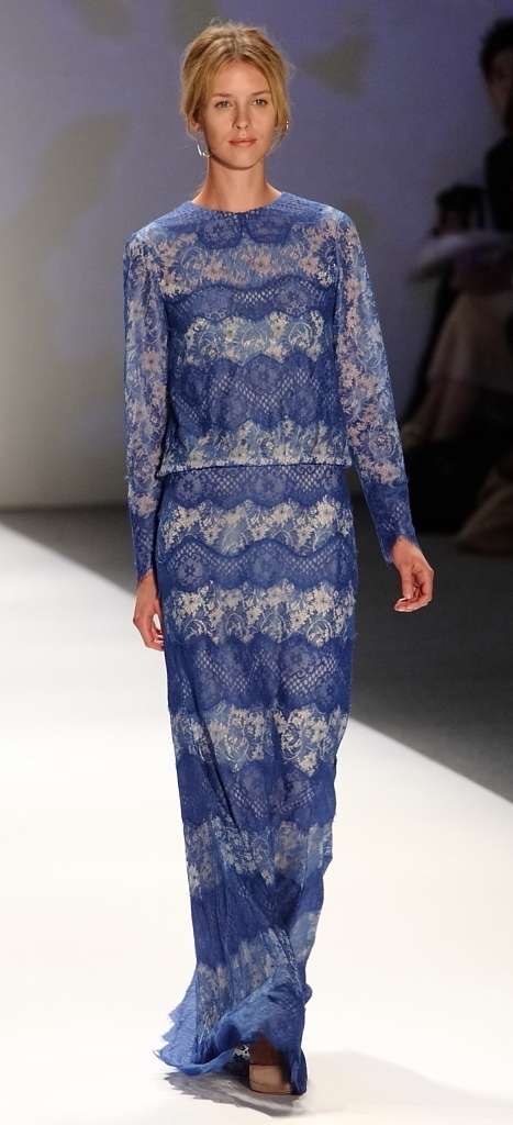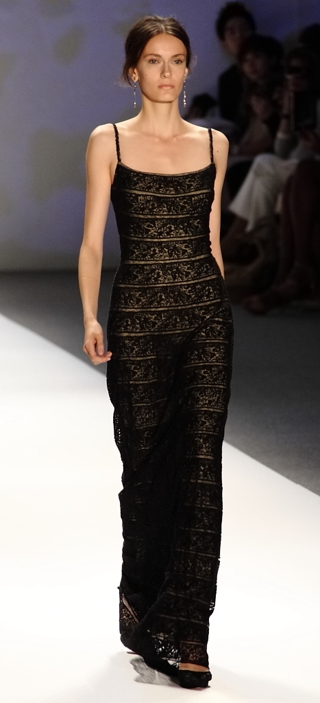 Next stop: delicate lace in lighter-than-air pants and dresses that could have come from the sewing rooms of France. Then it was on to the desert for long dresses and gowns, one in a sand that was so gentle compared to the pops of color that followed. Stripes in tribal colors moved us along to map in this fantastic journey, one in the most amazing shades of green I’ve ever seen, another in blue jewel tones. A group of dresses in a fabric that almost looked tie-dyed were young, feminine and gorgeous.