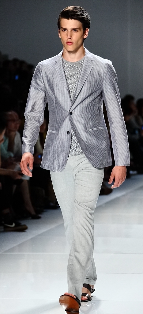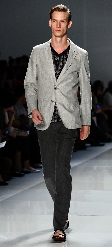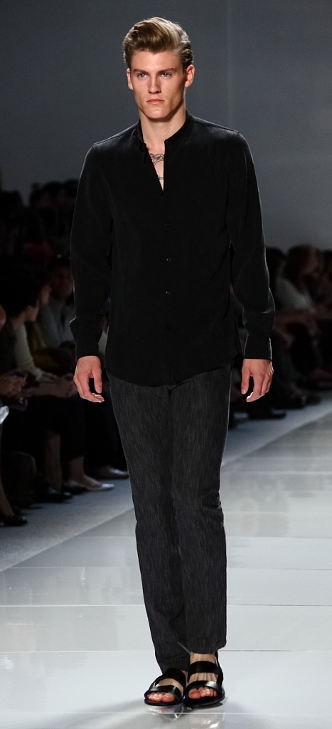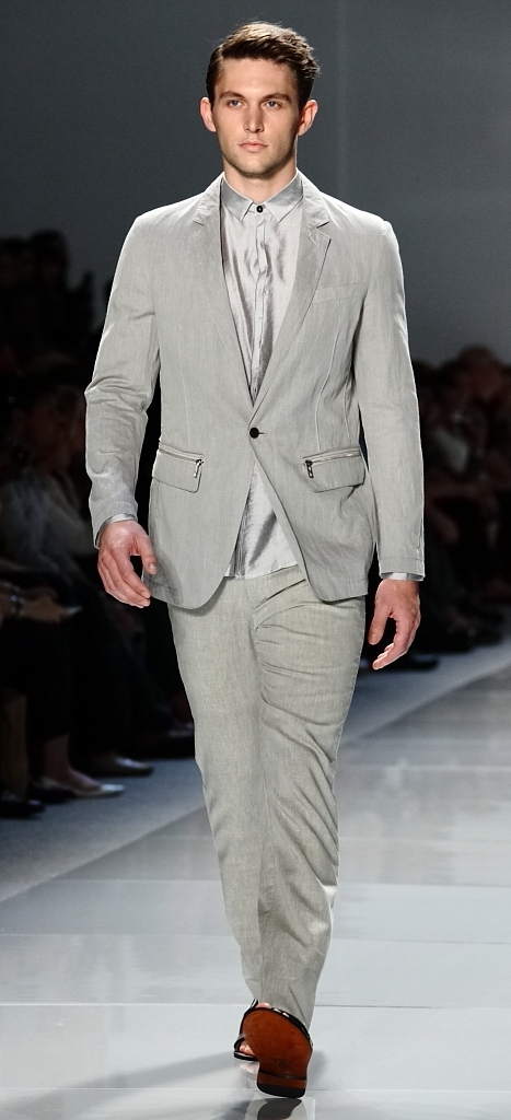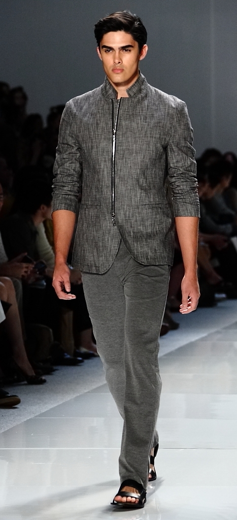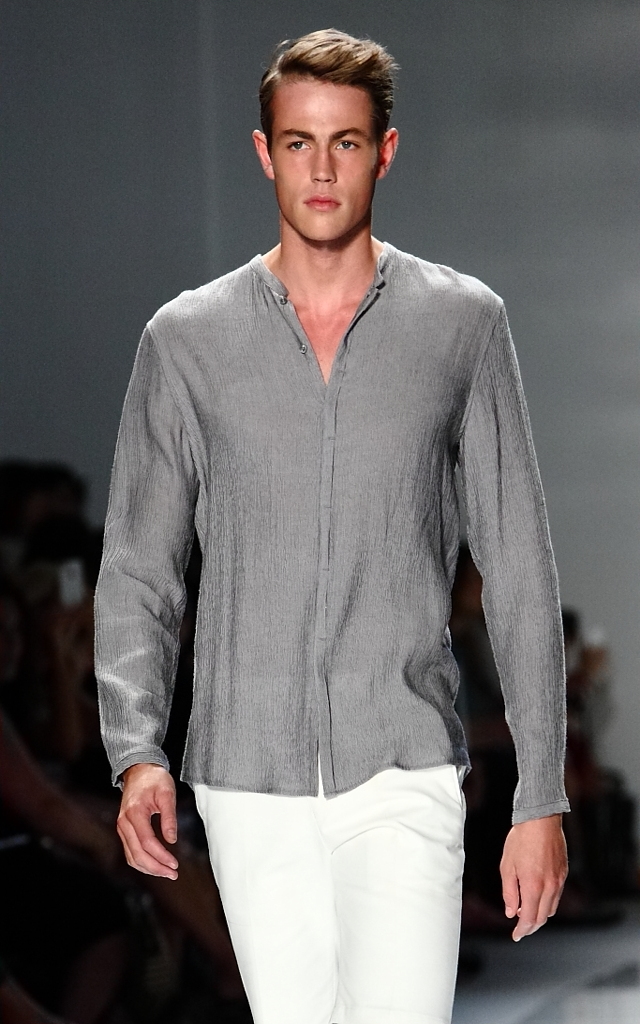 Then, there’s color: light and airy pastel blues and greens, grays and tans. Finally, the details, different collars, high, low, vaguely Nehru or asymmetrical and varied fabric choices as well. The details showed in his shirts, as well with subtle prints in the soft pastels that ran through this whole collection.