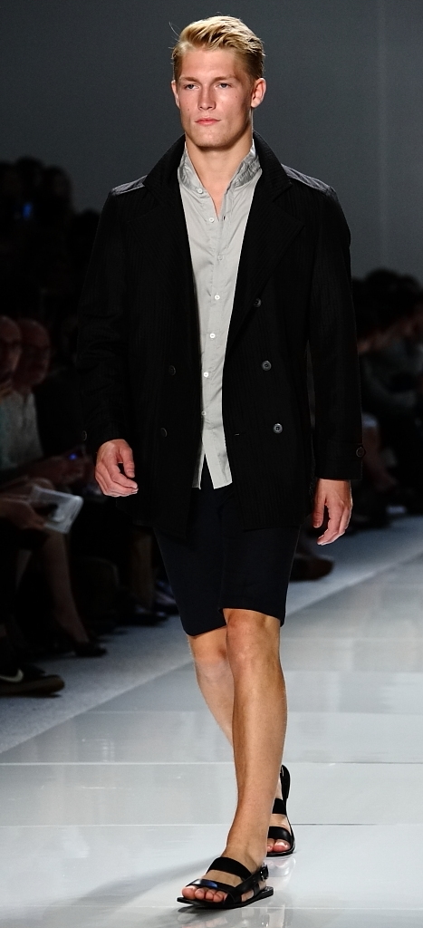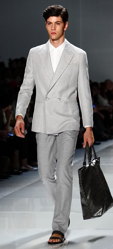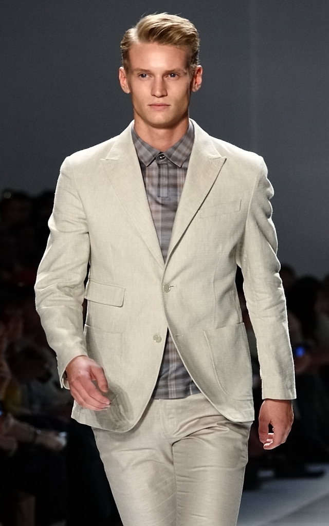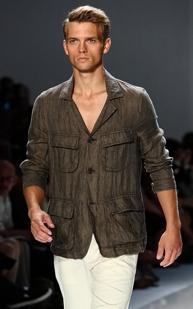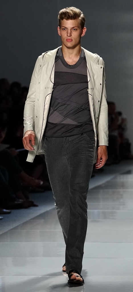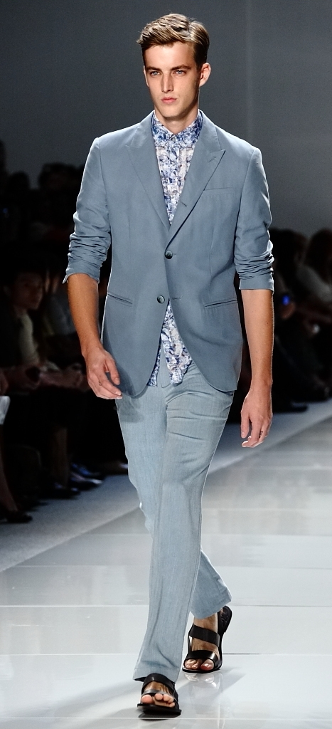 Then, there’s color: light and airy pastel blues and greens, grays and tans. Finally, the details, different collars, high, low, vaguely Nehru or asymmetrical and varied fabric choices as well. The details showed in his shirts, as well with subtle prints in the soft pastels that ran through this whole collection.