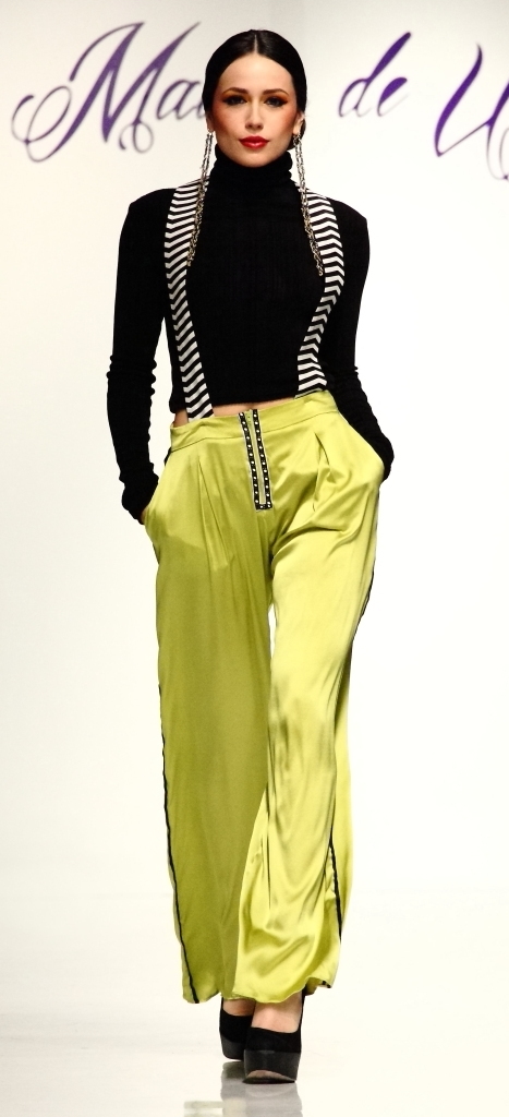 Urbana began her career in music as a backup singer and a stylist to rap stars. So her journey into the Middle East was tempered by a real feel for the street, which came through perfectly in sparkling beaded pants or sexy, tie-dyed evening wear. Her daywear was comfortable, wearable and colorful. Her mixture of prints and textures really brought the collection to life.