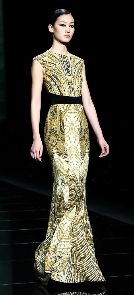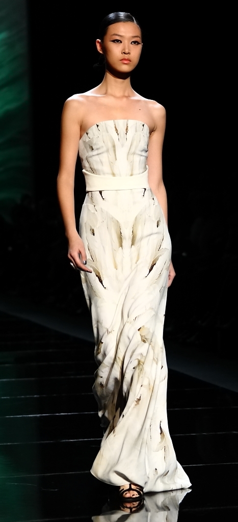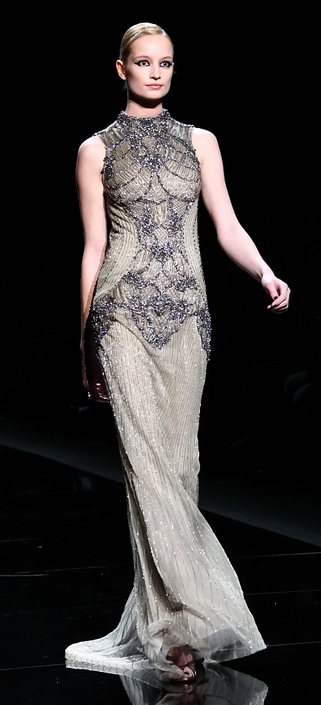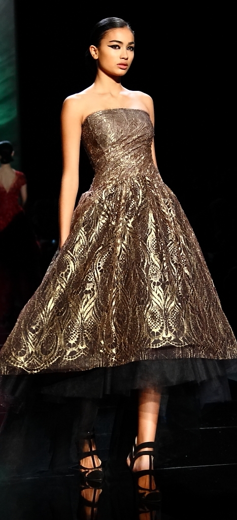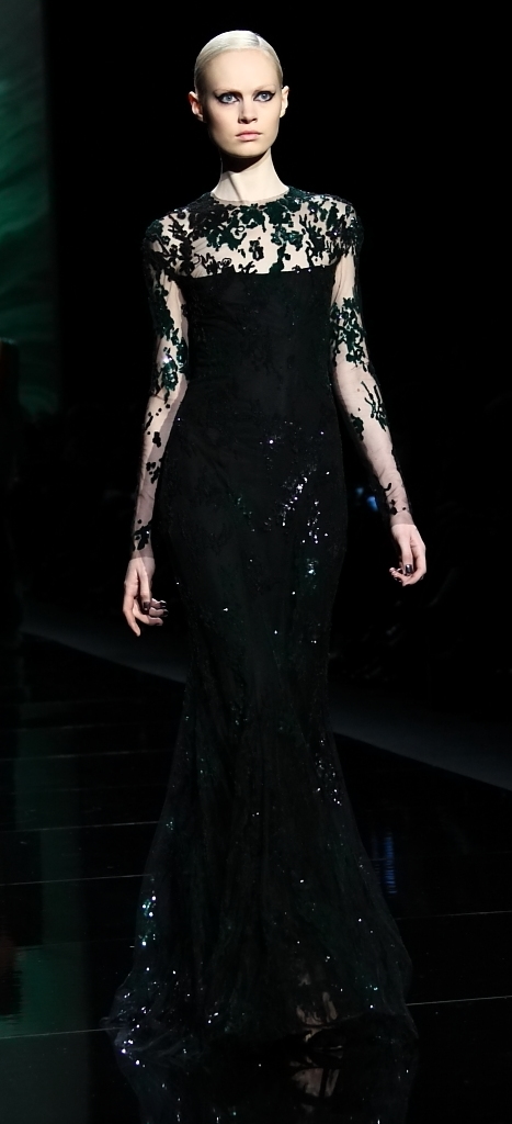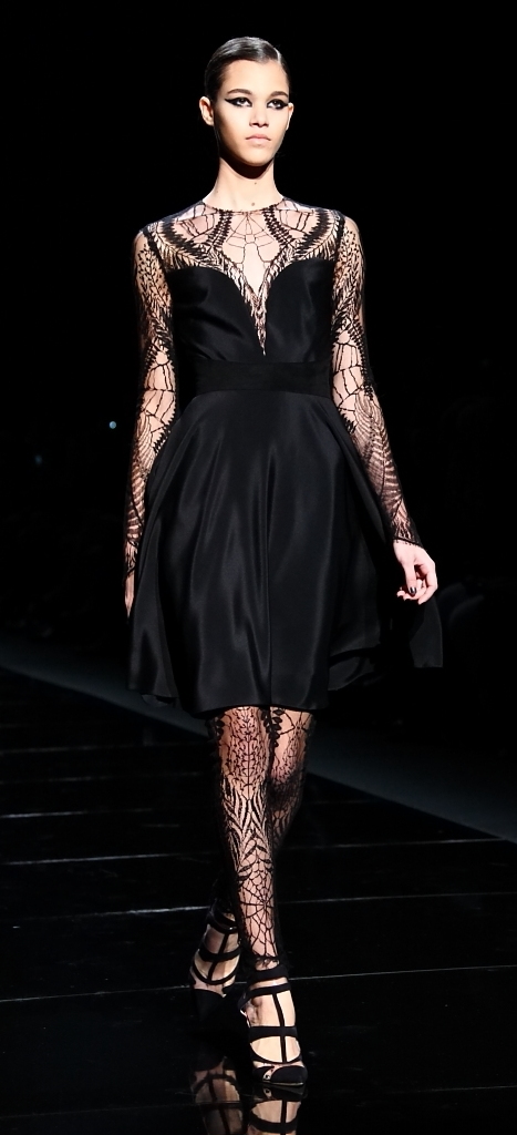 And, with that, we were eased into the main event: evening wear. L’Huillier is, of course, famous for her lavish Red Carpet gowns, and that’s what had the crowd gasping with delight. A sheer-looking nude with a black spider-web pattern was beyond amazing. A black lace jumpsuit (I don’t know if you can really call it a jumpsuit), surrounded by tulle was stunning. It also came in red, for the even more daring.