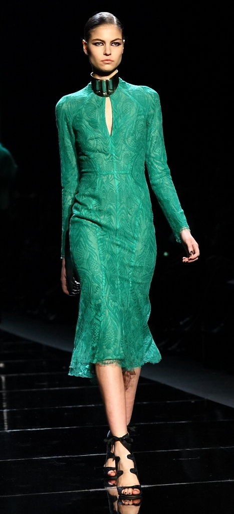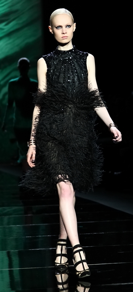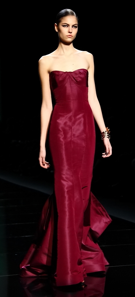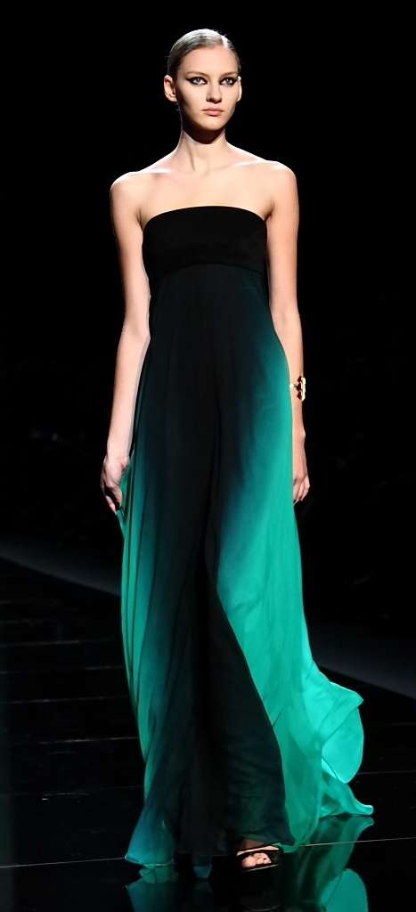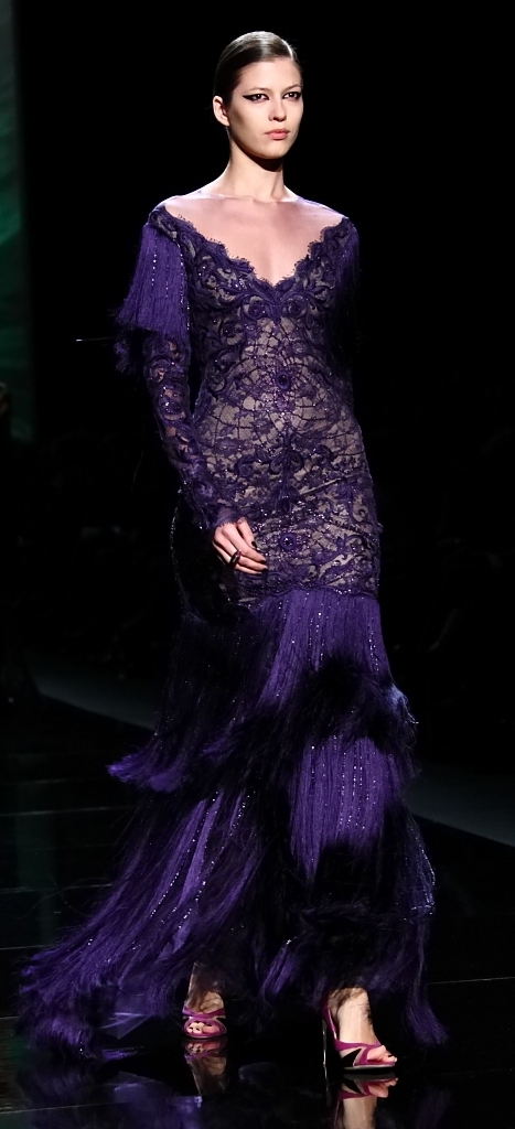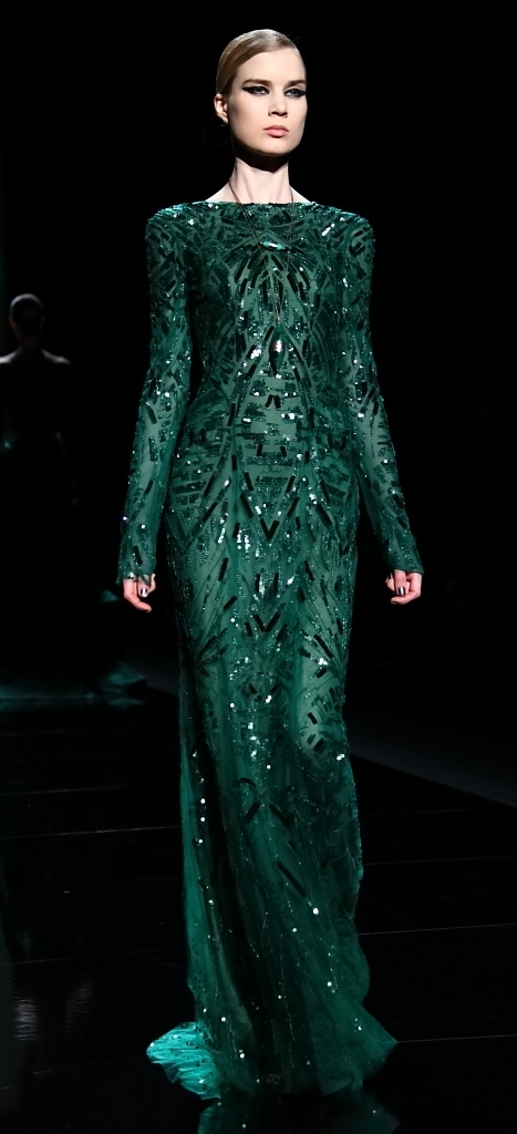 Then came the jewel-tones. That magnificent green of the backdrop translated into the most gorgeous flowing gown, with layer after layer of the shade taking the fall runways by storm (as it did the spring runways). Another, slightly darker green was embellished in black jet beading. Aubergines, purples and bright pops of red rounded out the collection.