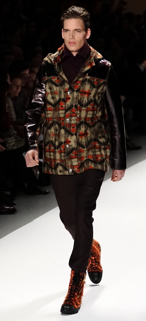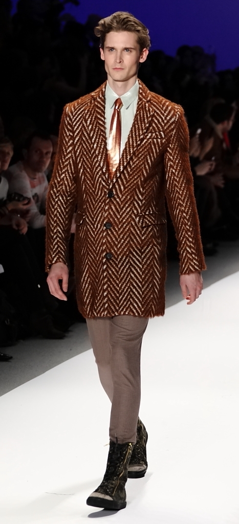His menswear line featured suiting in styles you definitely don’t see every day: long jackets, wild prints from checks to stripes to tribals and everything in between. Many were embellished with little pops of leather on the sleeves or shoulders.