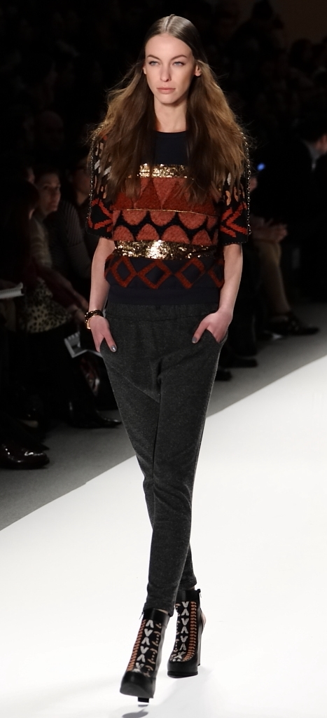 Women’s pants were relaxed, but nipped at the waist to keep from going boyfriend. One tweedy-looking pant paired with an almost art-deco looking jacket was a real standout, as was a short, tribal print jacket cinched by a leather belt. There was sparkle and shine in almost every piece.