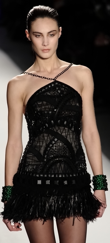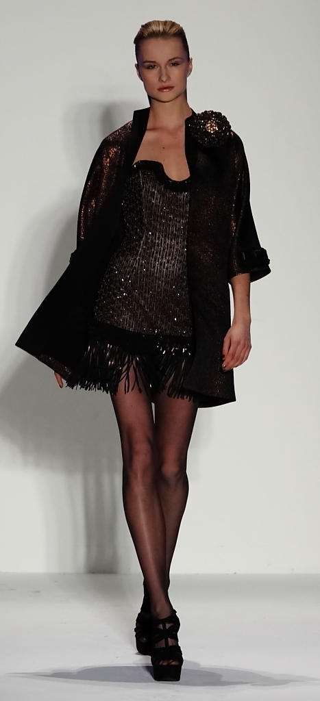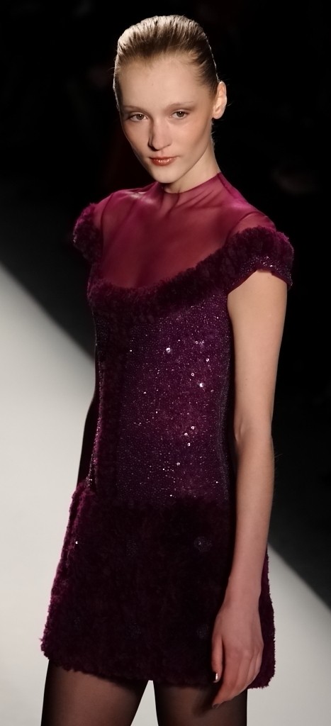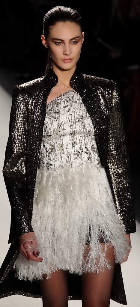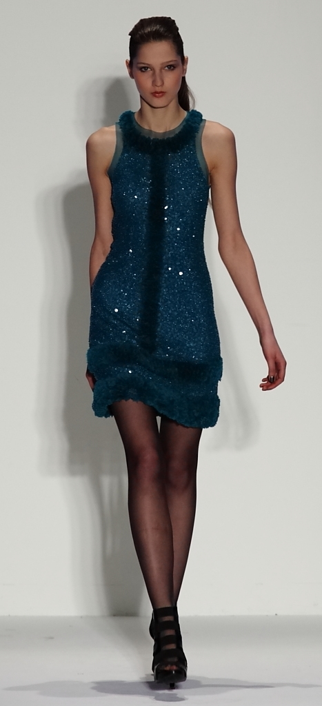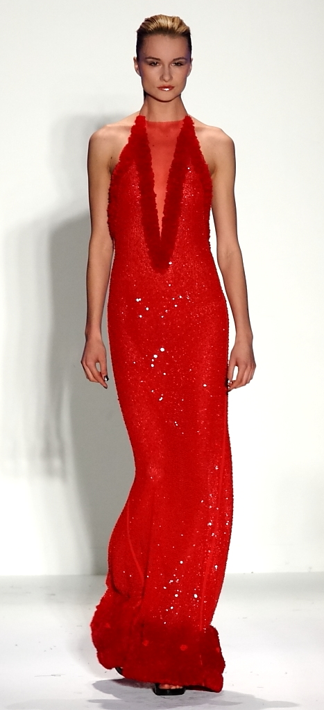 She started with shining metallics, in short party dresses, long red-carpet looks and even a dressy two-piece. She then moved on to softer fabrics, playing with texture and embellishment. Rosettes lined the necklines, and every piece sparkled. Rich jewel tones turned sexy with see-through panels, and everything sparkled.