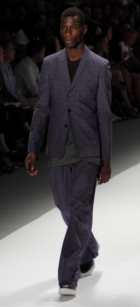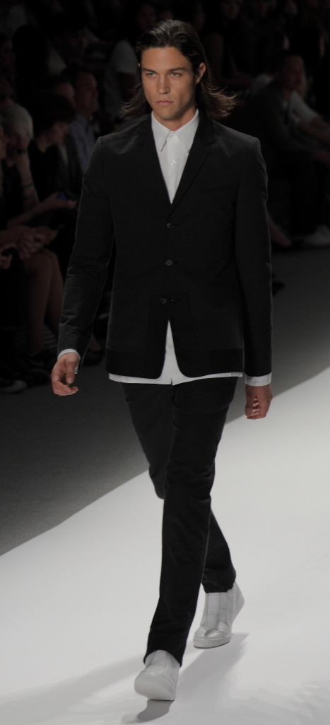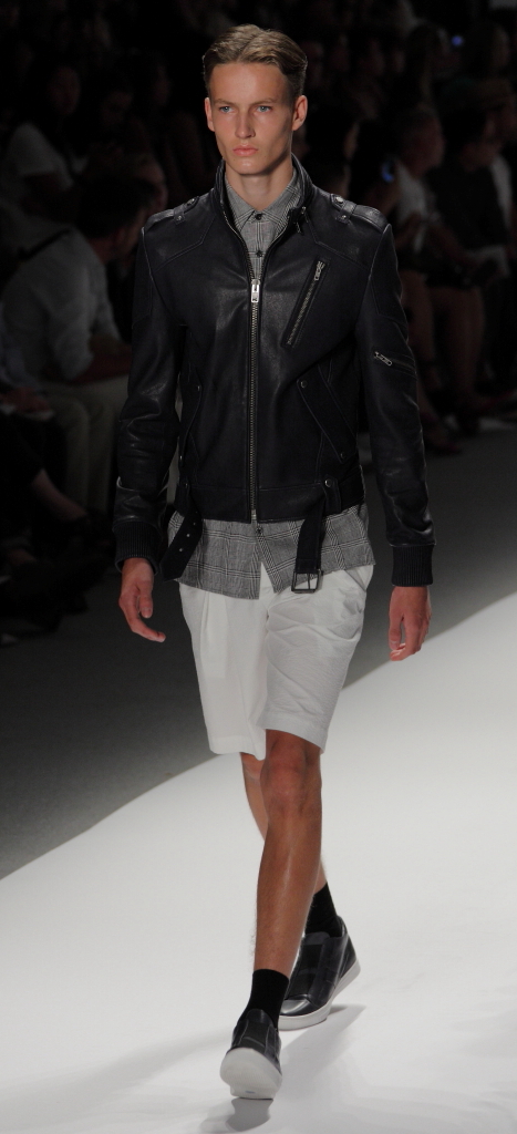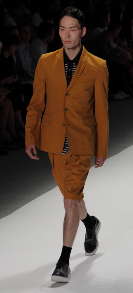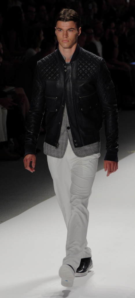 His menswear line was also basic white, a clean look that took you back to a different era with pops of blue and bright orange. His partnership with Andrew Marc leathers meant a heavy focus on the fabric, a little unusual in a spring collection. But, mixed with the lightness of his other materials, and the beautiful mix of textures, he really pulled it off.