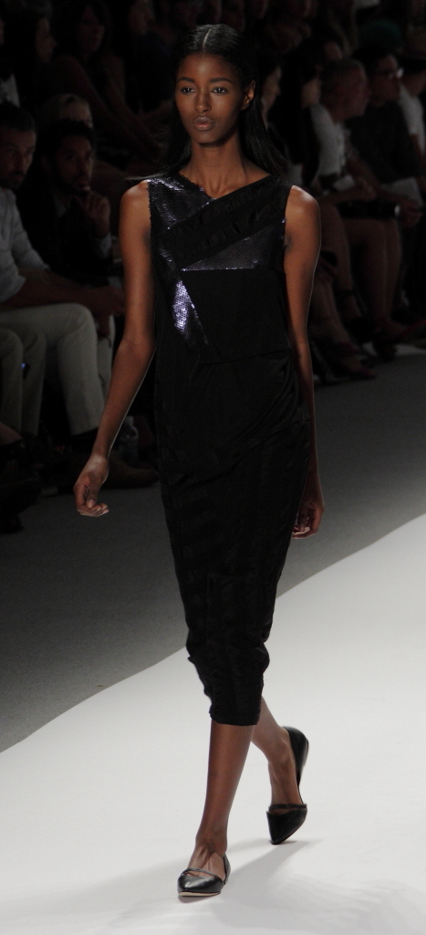 For those who are a bit color-phobic, there was a generous selection of blacks for both men and women: skirts, tops, suits and slacks. That carried through his party wear, sequined and sparkly for fun summer nights on the town.