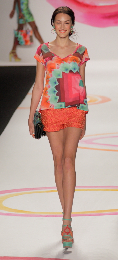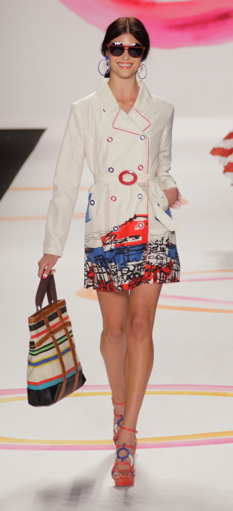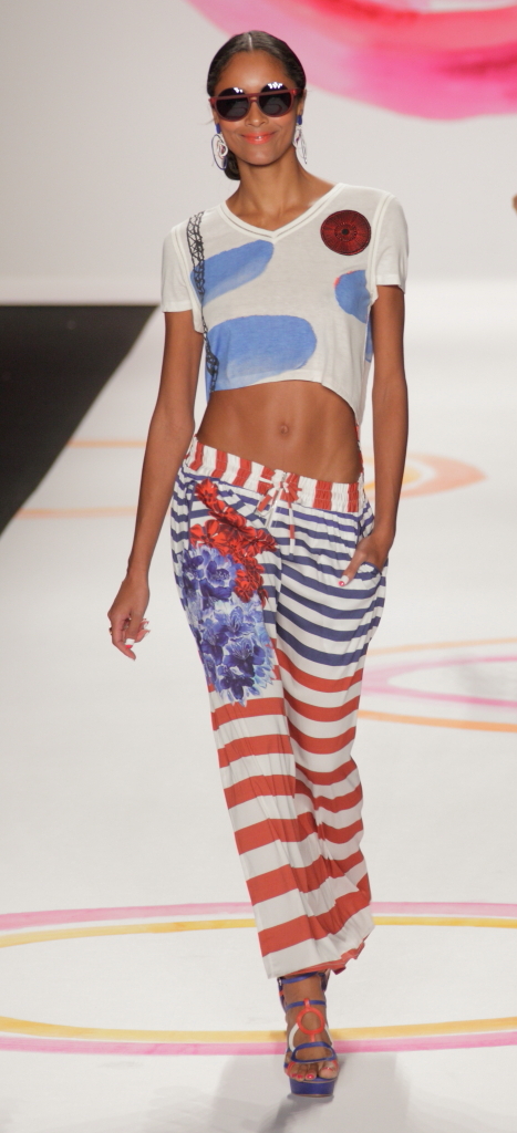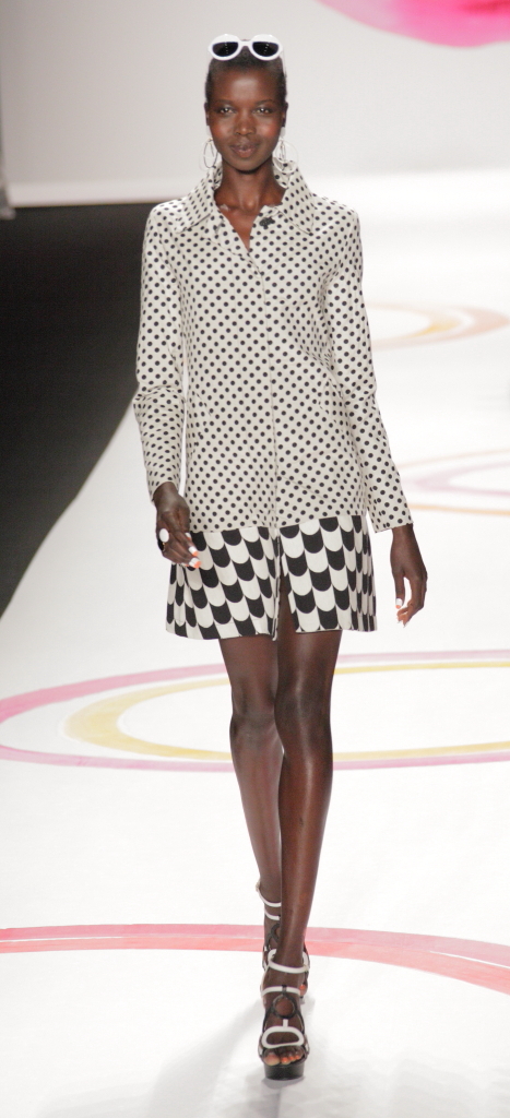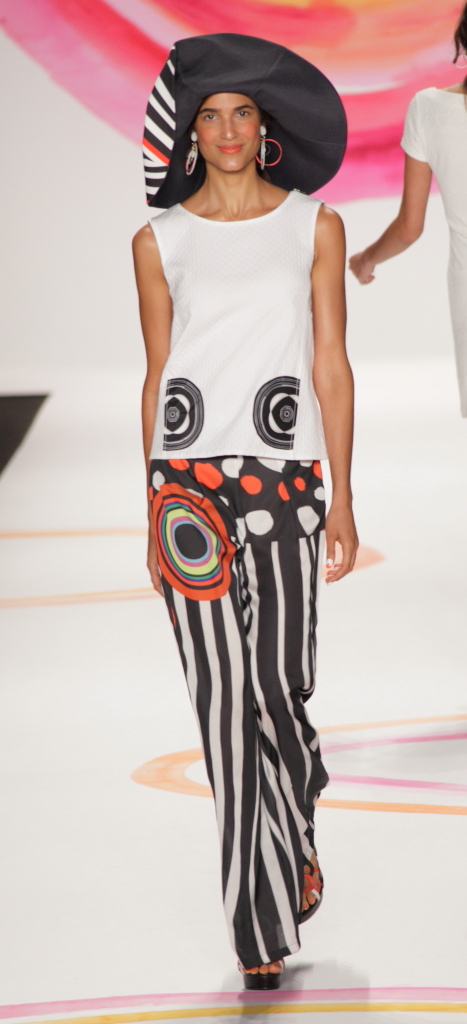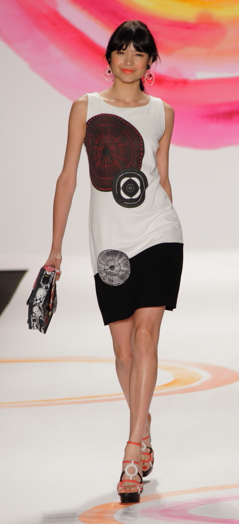 The show’s theme, not surprisingly, was “For Everybody, Fun, Sex and Love.” Models strutted, danced, waved and winked their way down the runway, a preview of the way our lives should be when we’re decked out in Desigual. Fun was black and white and mod, all over, a mix of graphic prints and giant flowers in perfect summer dresses, coats, skirts, big floppy hats and totes.
