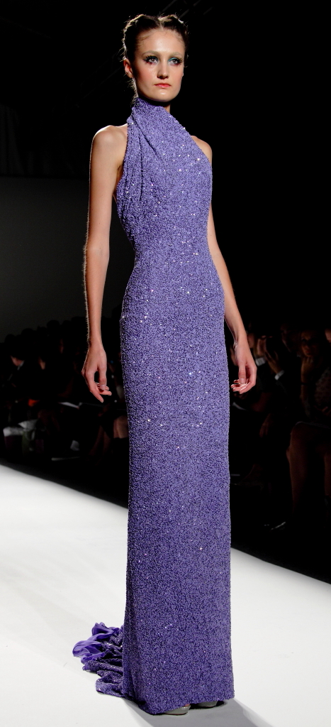Sequins shimmer on soft overlays, turning simple silhouettes into something special. A strapless, black fishtail dress shined under every runway light. Lace overlays added to the elegance, with soft satins shining through. Ruffles and draping were also used to incredibly beautiful effect.