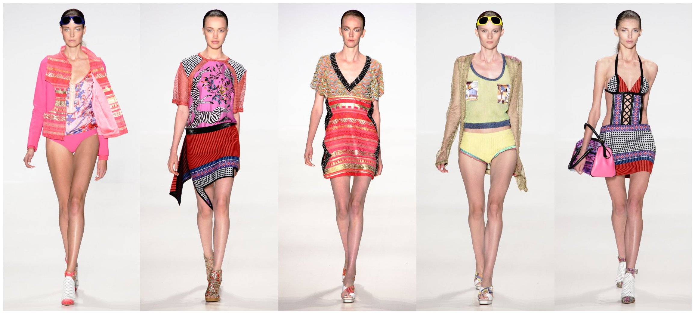 Along with the bright, shiny patterns and wild color combinations that have for so long defined this label there was a definite pushing of the envelope. The skirts were a little shorter, some dresses had more keyhole cutouts than actual fabric, tops were cut seriously low and swimsuits were skimpier. And the best news for Custo fans, it all works.