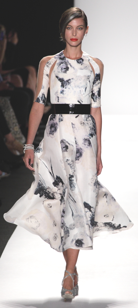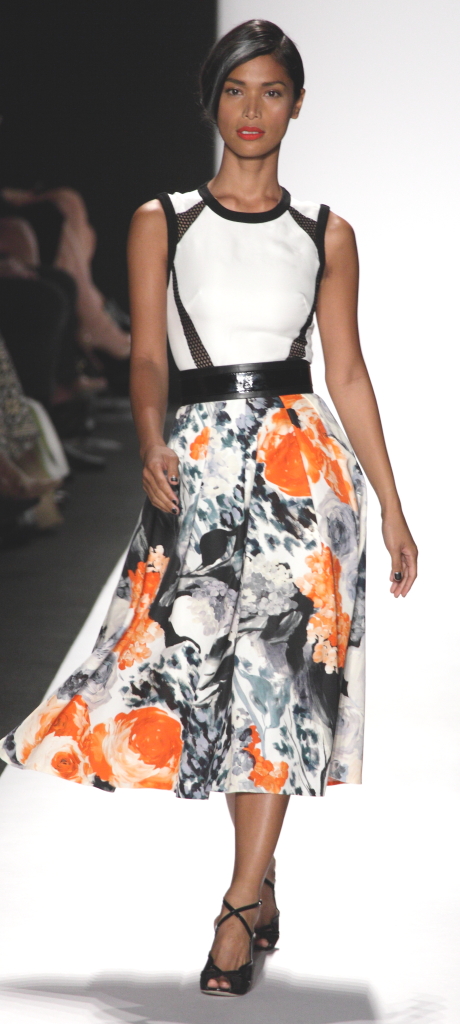 The florals bloomed in onesies, sleek halter dresses and big, swing skirts. The colors were big and bold and bright, the fabrics, were summer classics, silk organza, gazaar and what he called, “a modern marriage of metal and mesh.” The solids, too, were striking, the brightest whites, creamsicle orange, electric blue.