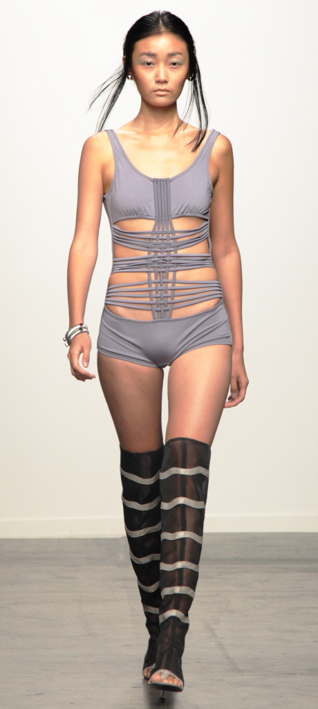 Her choice of fabrics made the collection even more interesting: cream silks, sheer, gauzy cottons and leather. Swimsuits, too, took on a futuristic bent, especially a grey one piece with a series of cutouts, and another sexy lilac one-piece.