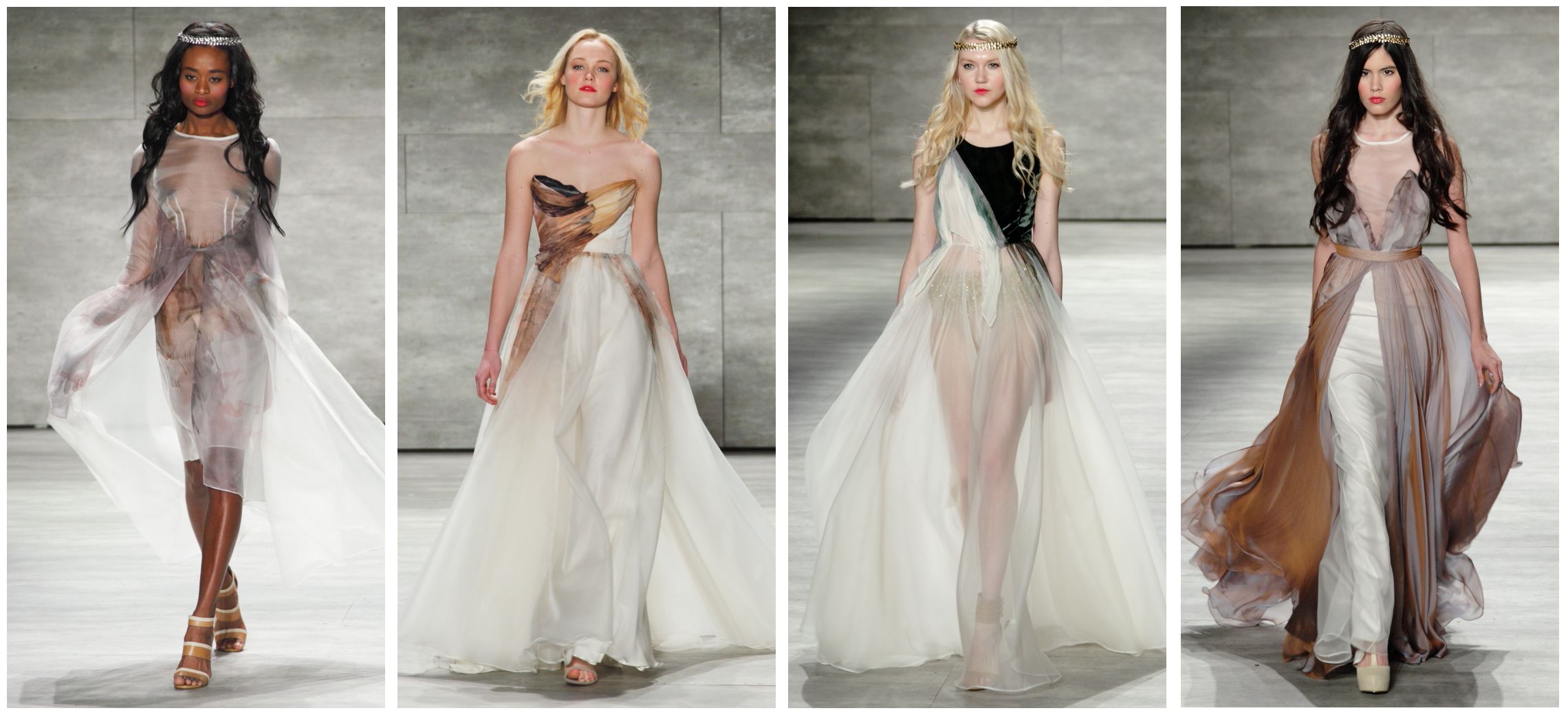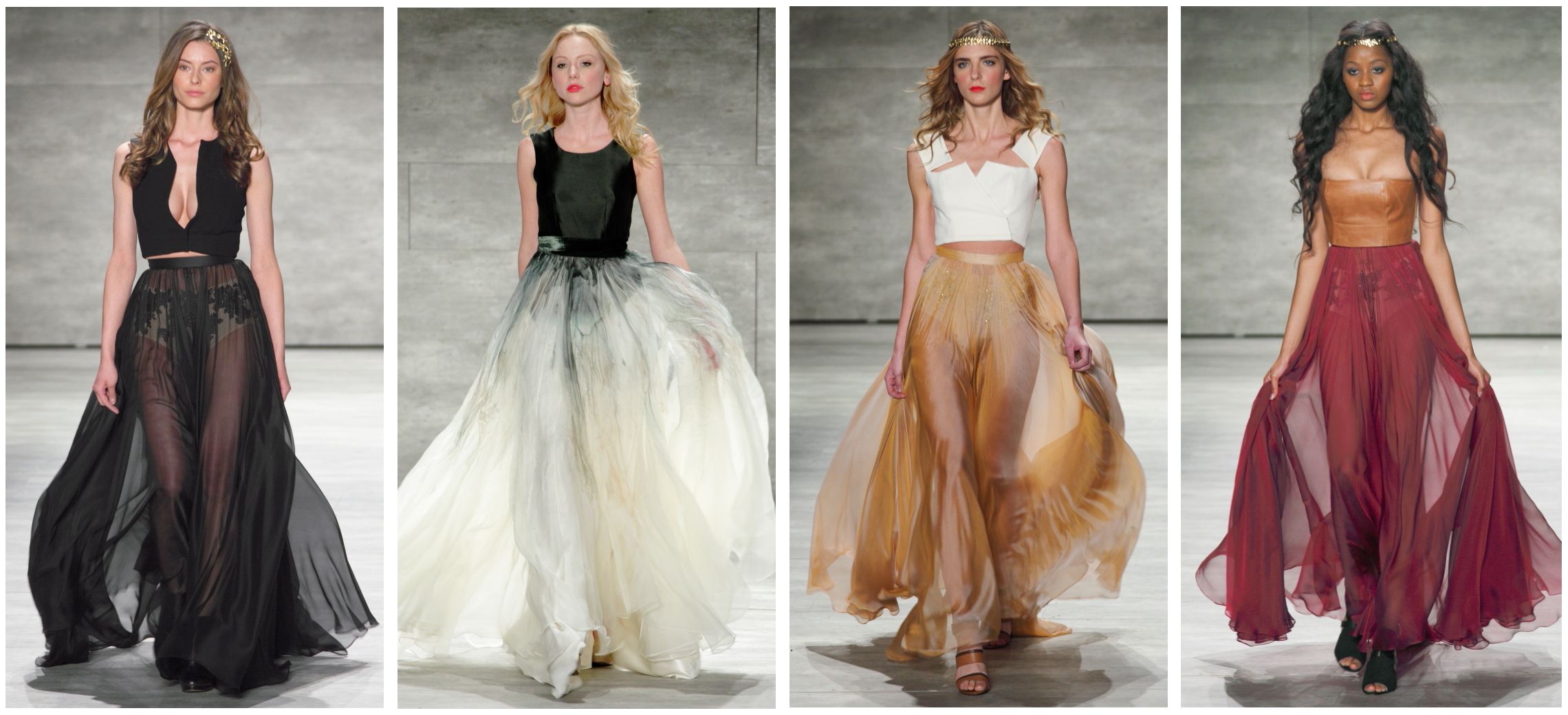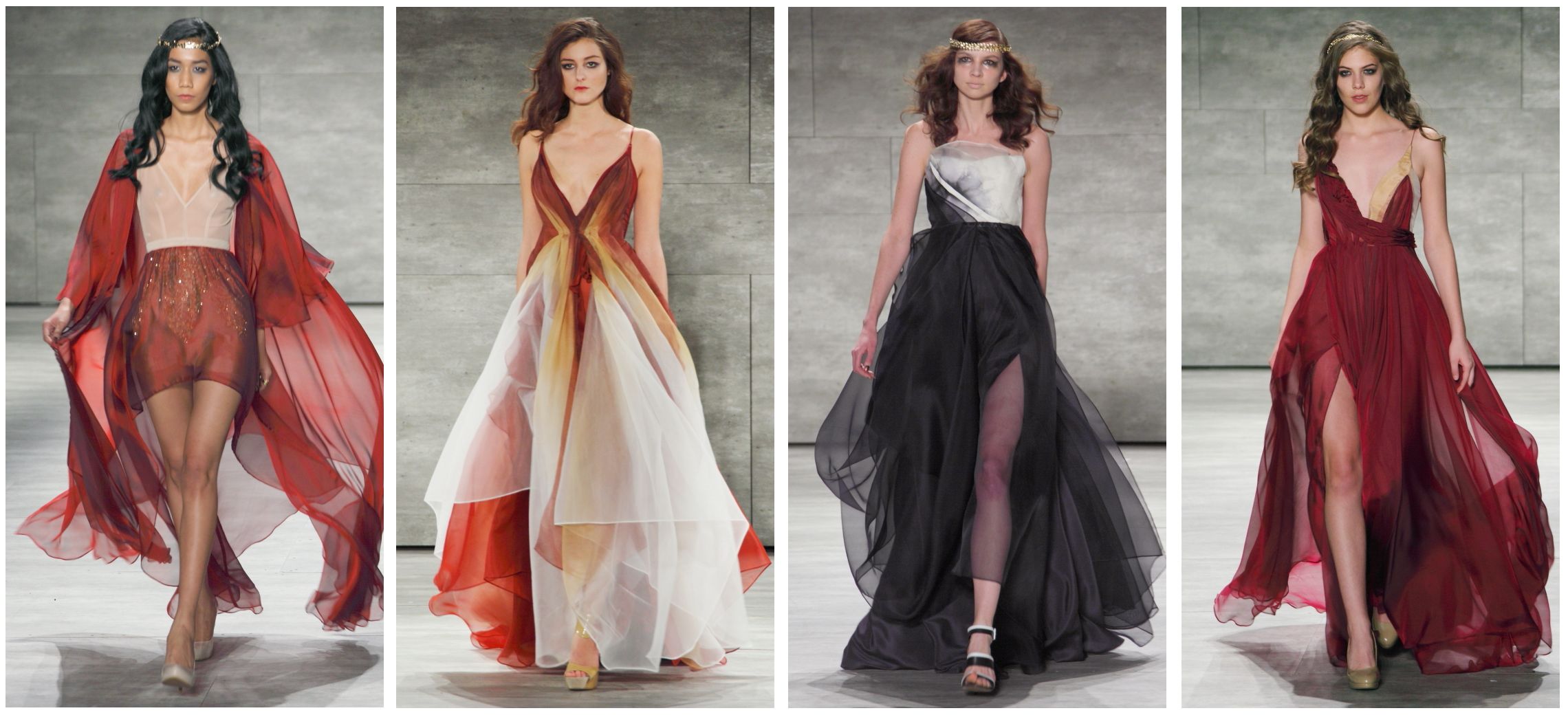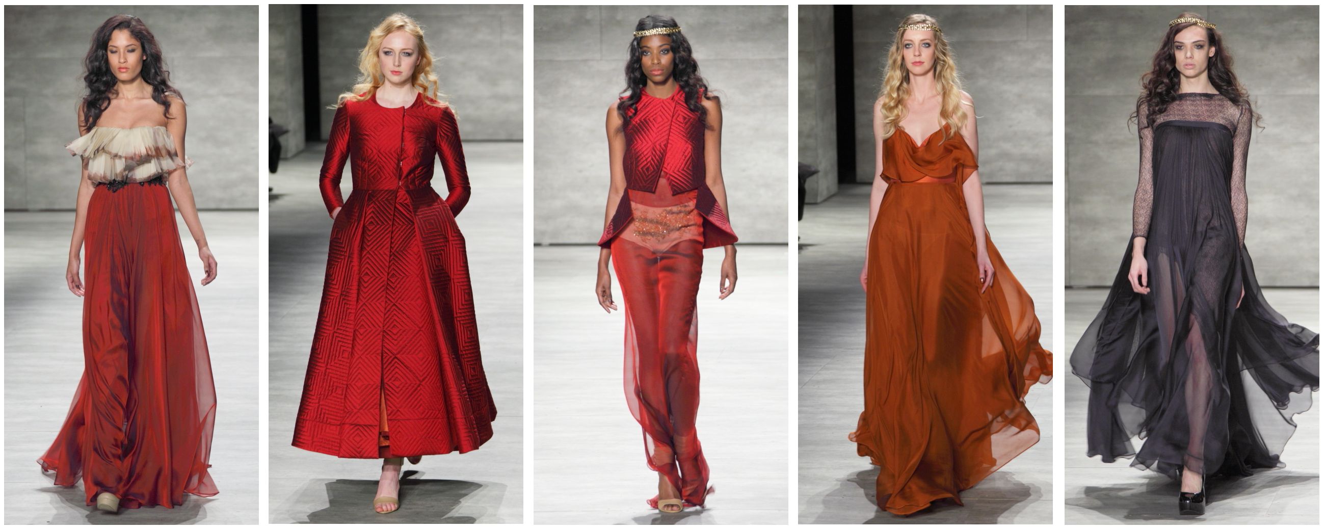 There were beautiful splashes of gold and bronze in the sheerest of fabrics and the minimal accessories. But it was when color became predominant that this collection really shined. The blacks gave way to creams, which gave way to gold, then deep, deep red and a rich rust, reminiscent of something out of a Pre-Raphaelite painting.