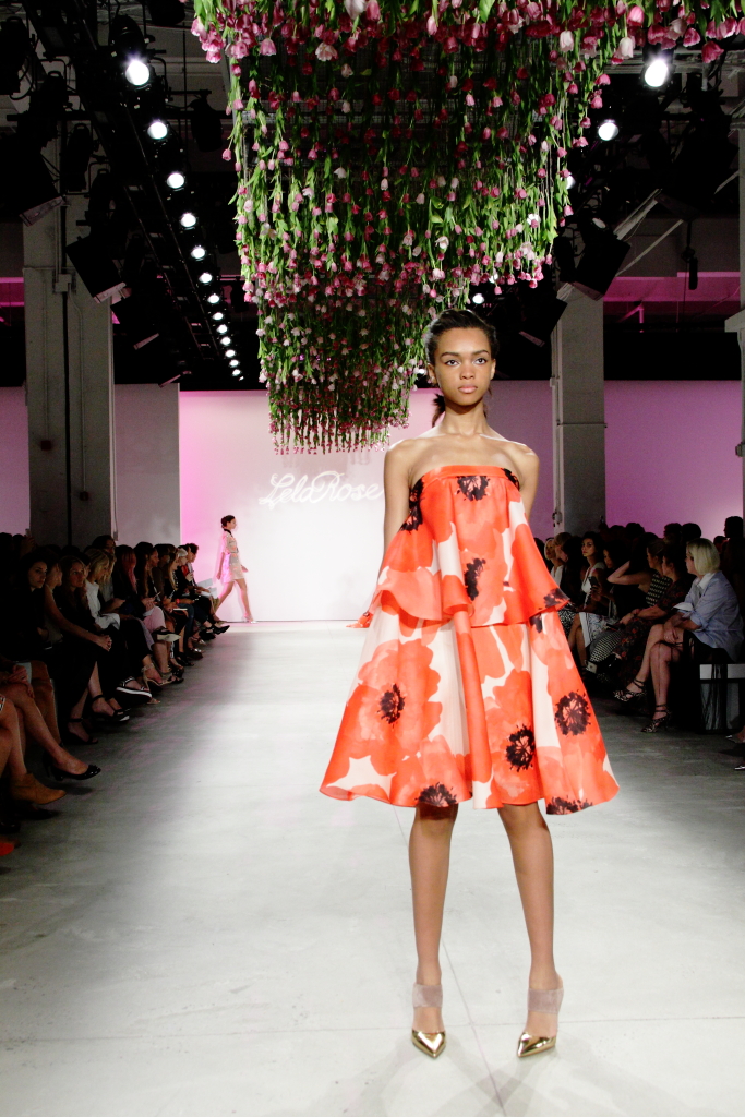 The first thing you notice when you walk into the room is the flowers, on the seats, hanging from the ceiling, flowers everywhere, and a bright, pink glow. Yes, flowers are the international symbol for Spring, but for Lela Rose, they are also “a stage for the exploration of infinite color variations”.