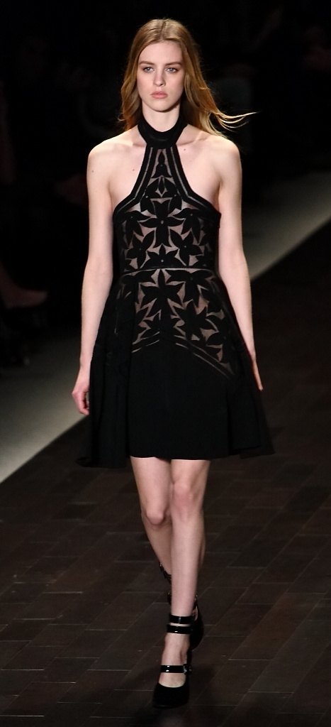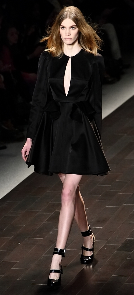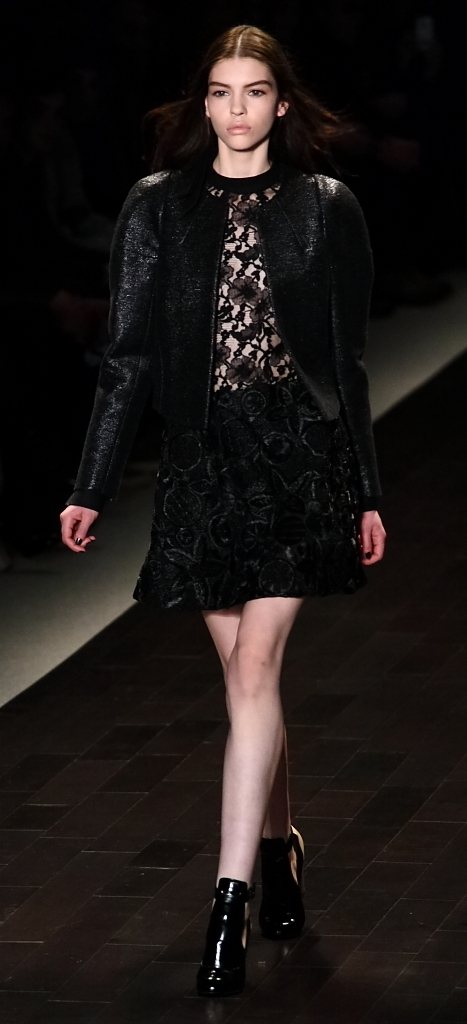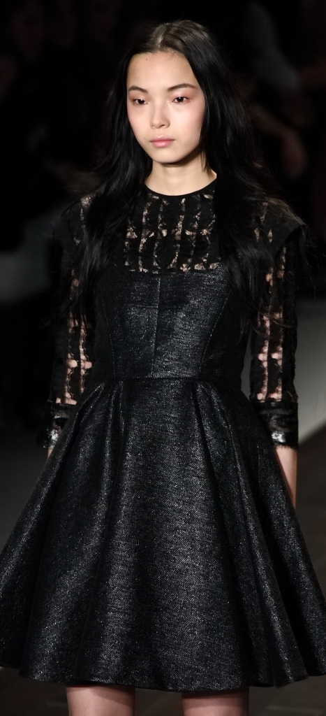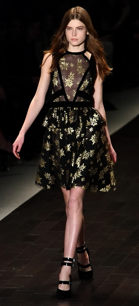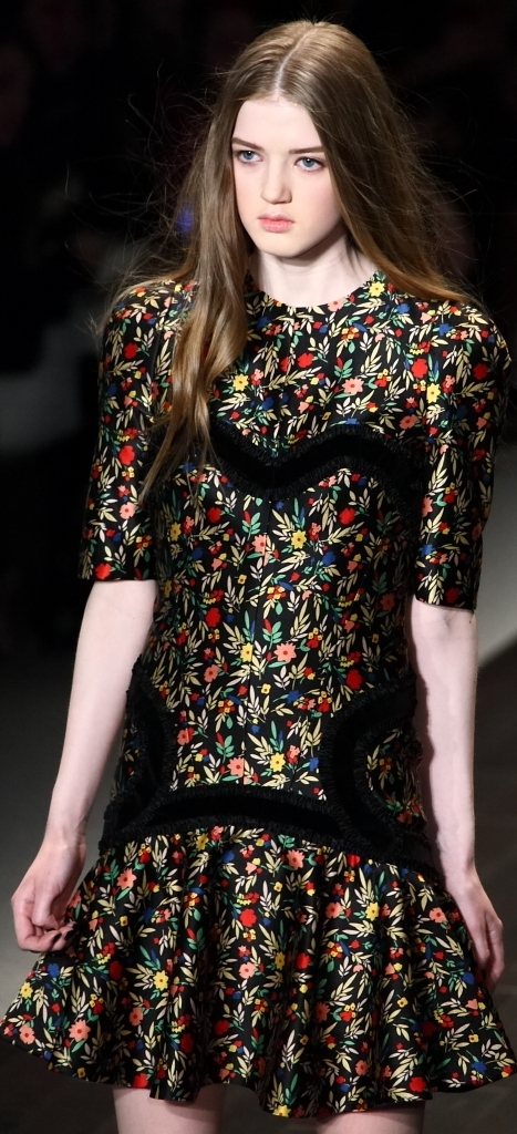 There was a definite femininity in the patterned tops, embellished with gold and grommets. Instead of bold color, there were more subtle blues, dusty pinks, greys and blacks. Form-fitted dresses and overalls were followed by patchwork prints and voluminous sweaters.